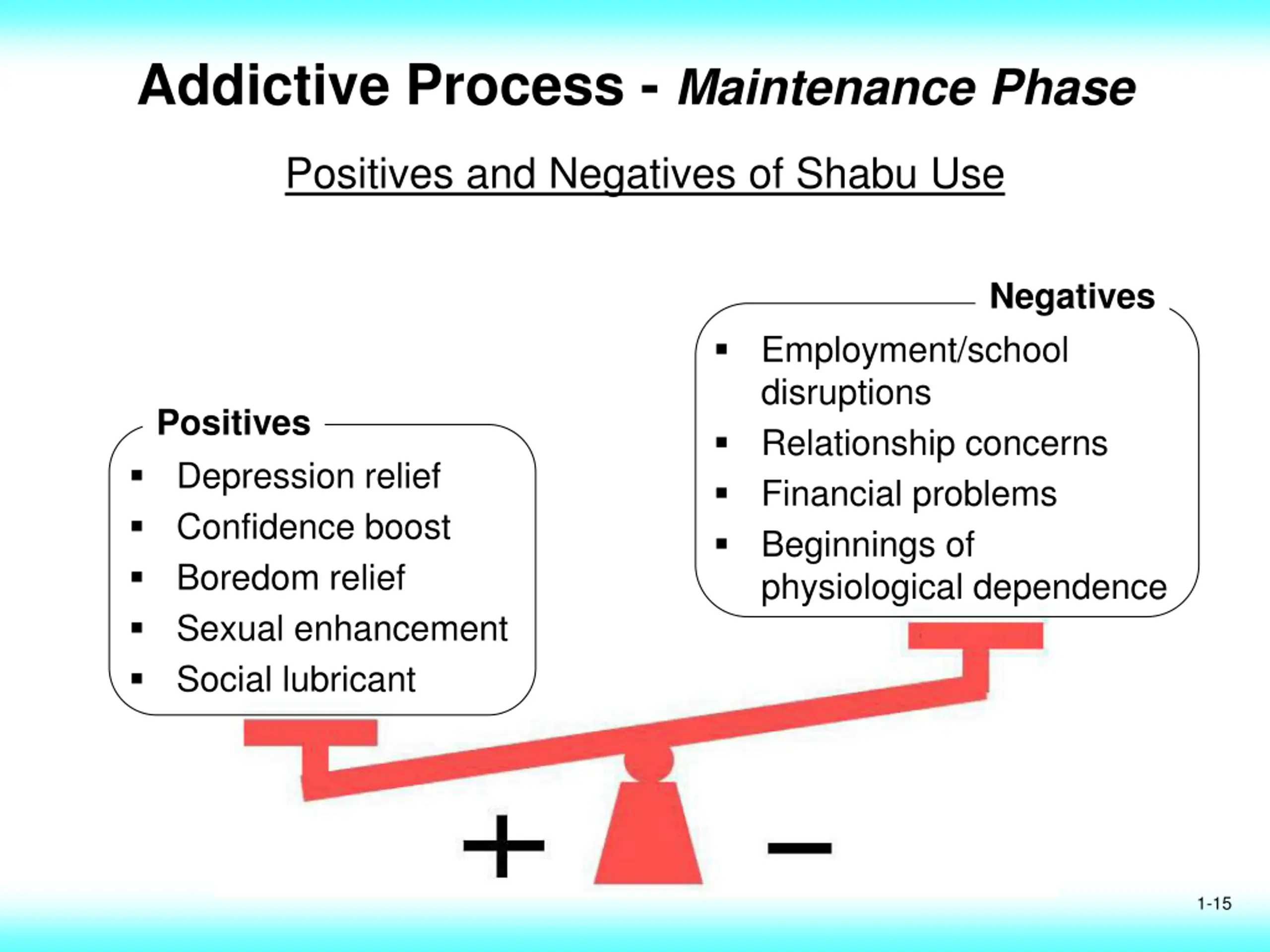 Addictive Process - Maintenance Phase Positives and Negatives of Shabu Use Negatives Employment/school disruptions Relationship concerns Financial problems Beginnings of physiological dependence Positives Depression relief Confidence boost Boredom relief Sexual enhancement Social lubricant 1-15