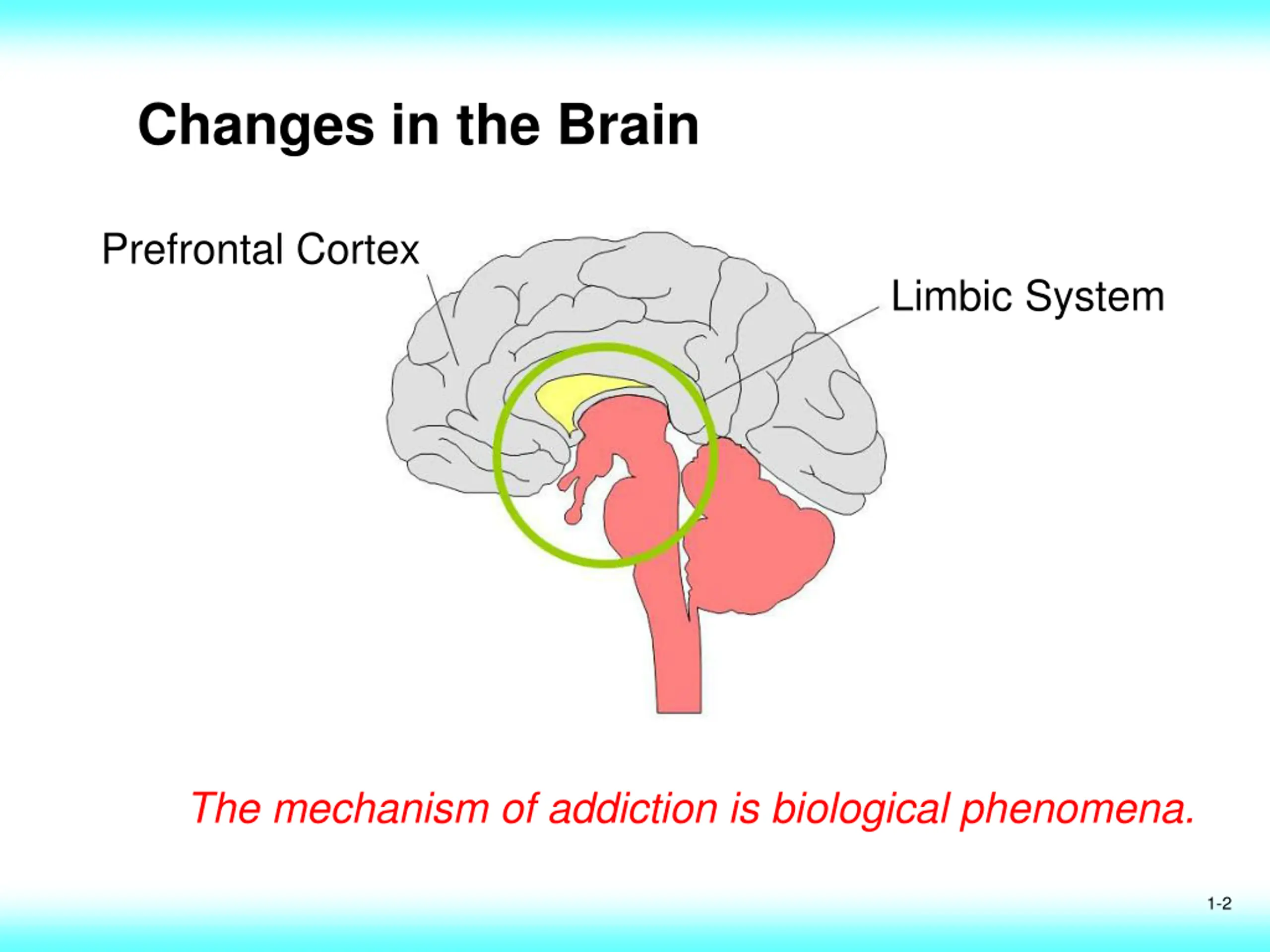 Changes in the Brain Prefrontal Cortex Limbic System The mechanism of addiction is biological phenomena. 1-2