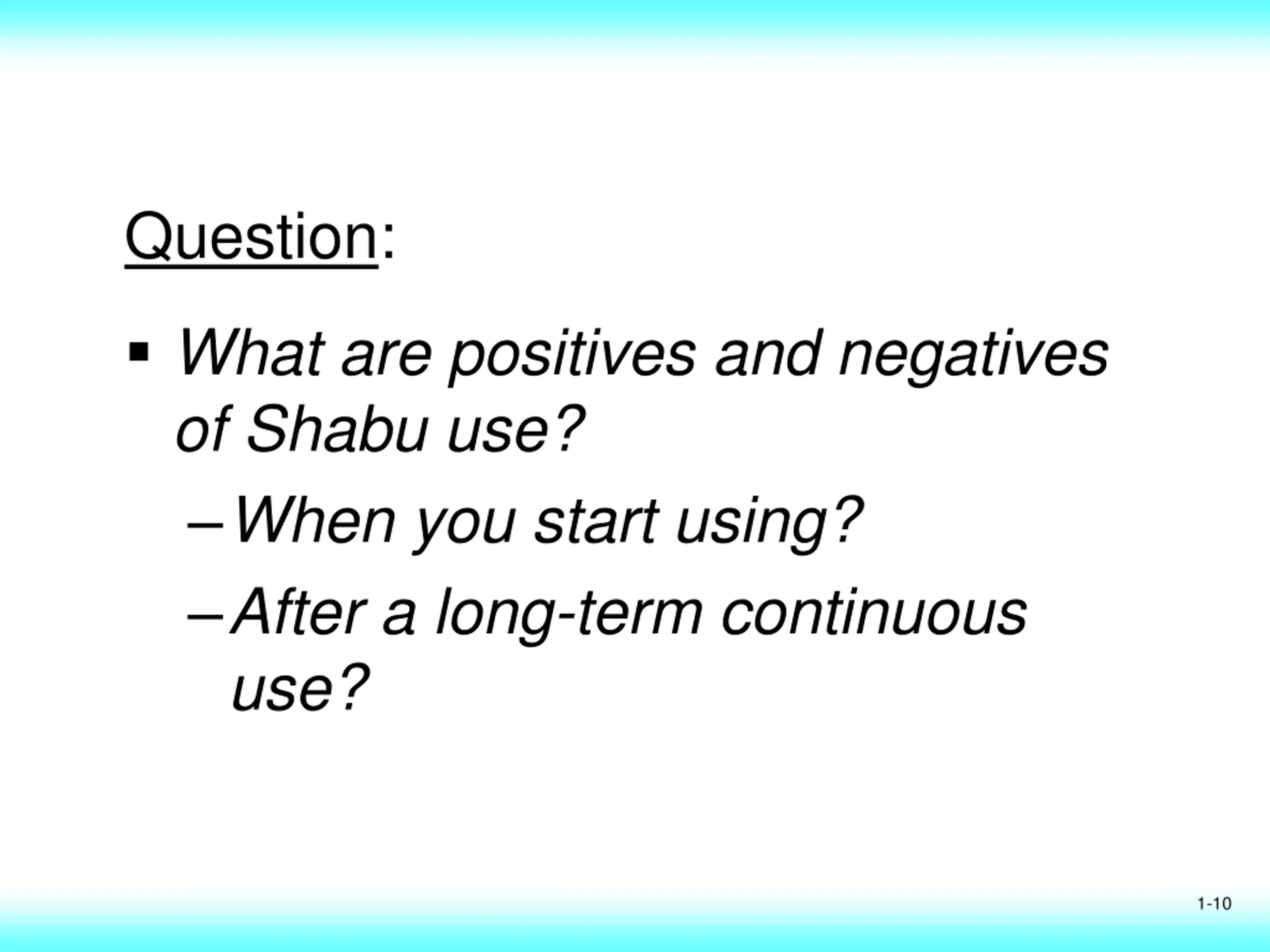 Question: What are positives and negatives of Shabu use? When you start using? After a long-term continuous use? 1-10