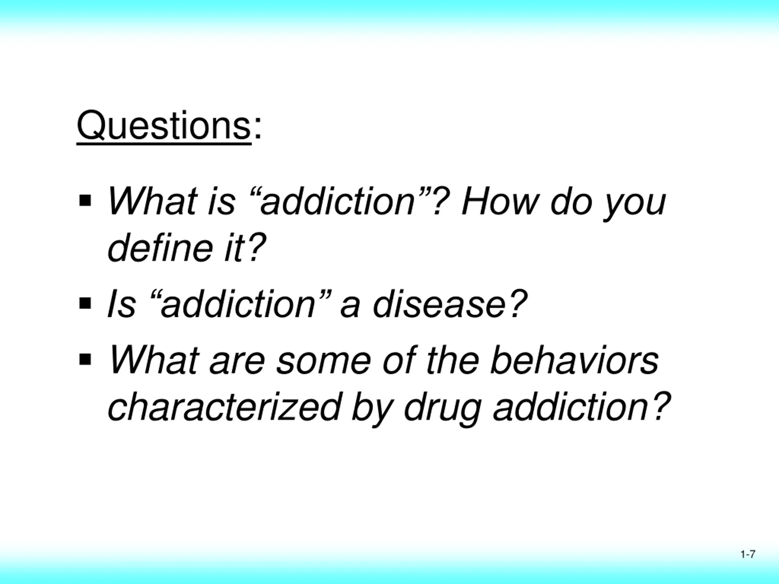 Questions: What is addiction ? How do you define it? Is addiction a disease? What are some of the behaviors characterized by drug addiction? 1-7