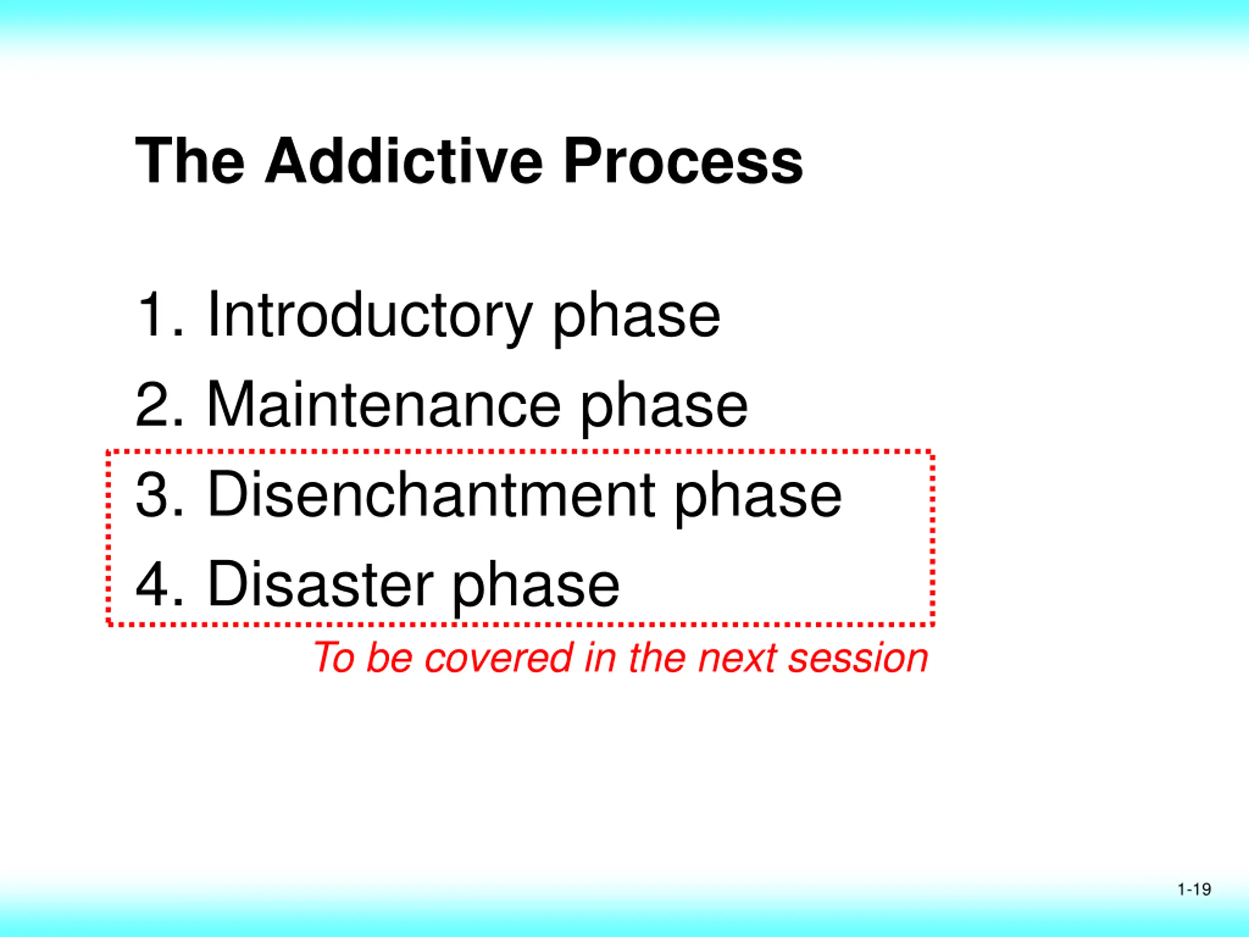 The Addictive Process 1. Introductory phase 2. Maintenance phase 3. Disenchantment phase 4. Disaster phase To be covered in the next session 1-19