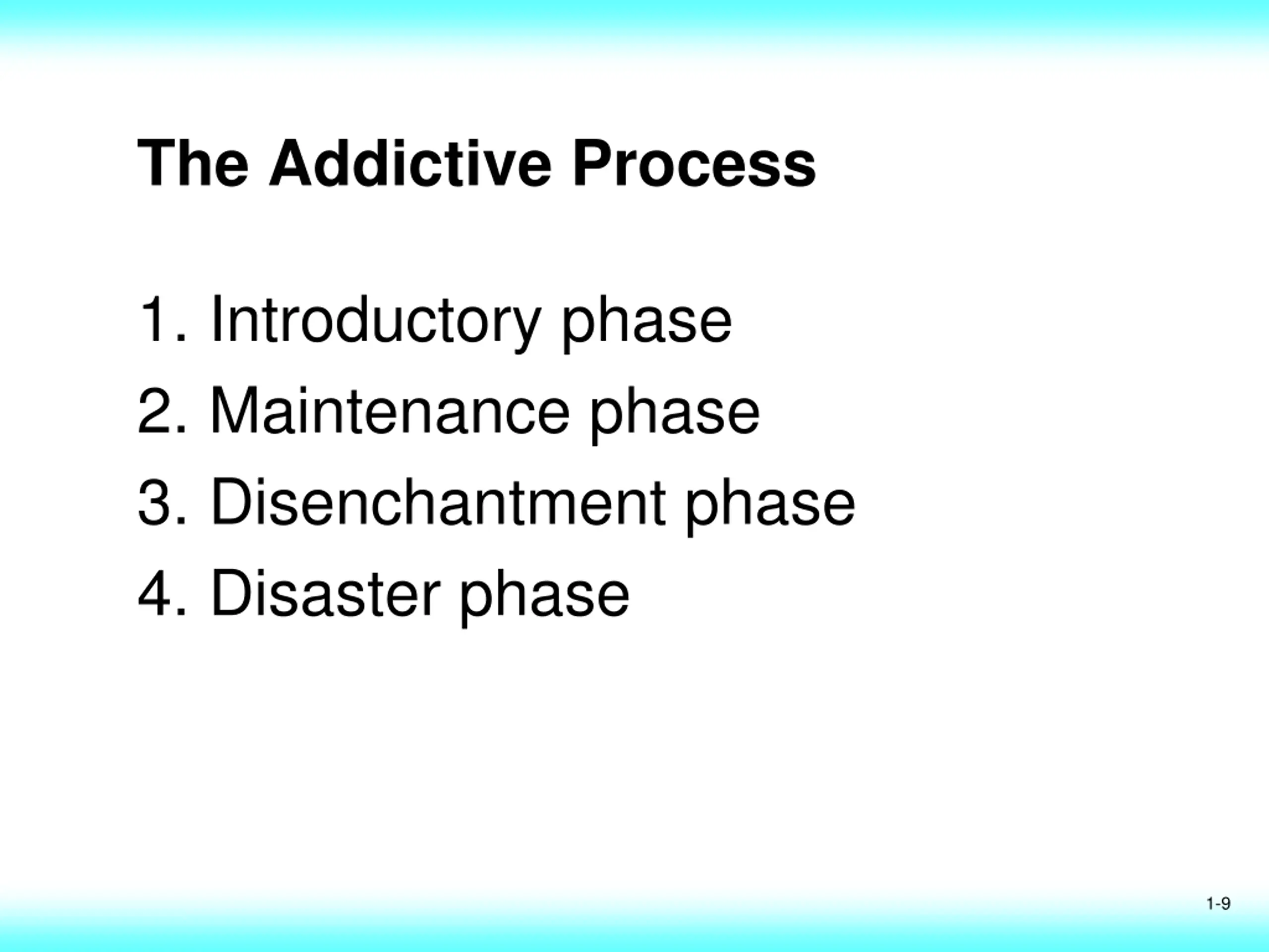 The Addictive Process 1. Introductory phase 2. Maintenance phase 3. Disenchantment phase 4. Disaster phase 1-9