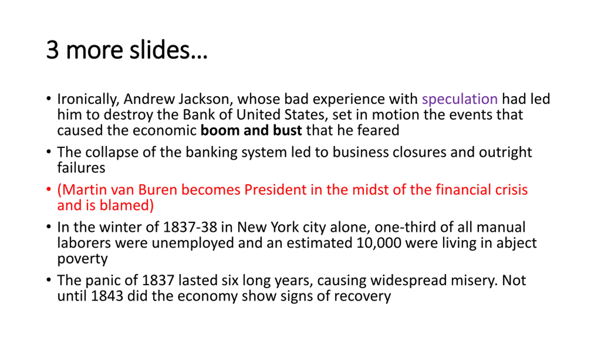 3 more slides 3 more slides Ironically, Andrew Jackson, whose bad experience with speculation had led him to destroy the Bank of United States, set in motion the events that caused the economic boom and bust that he feared The collapse of the banking system led to business closures and outright failures (Martin van Buren becomes President in the midst of the financial crisis and is blamed) In the winter of 1837-38 in New York city alone, one-third of all manual laborers were unemployed and an estimated 10,000 were living in abject poverty The panic of 1837 lasted six long years, causing widespread misery. Not until 1843 did the economy show signs of recovery