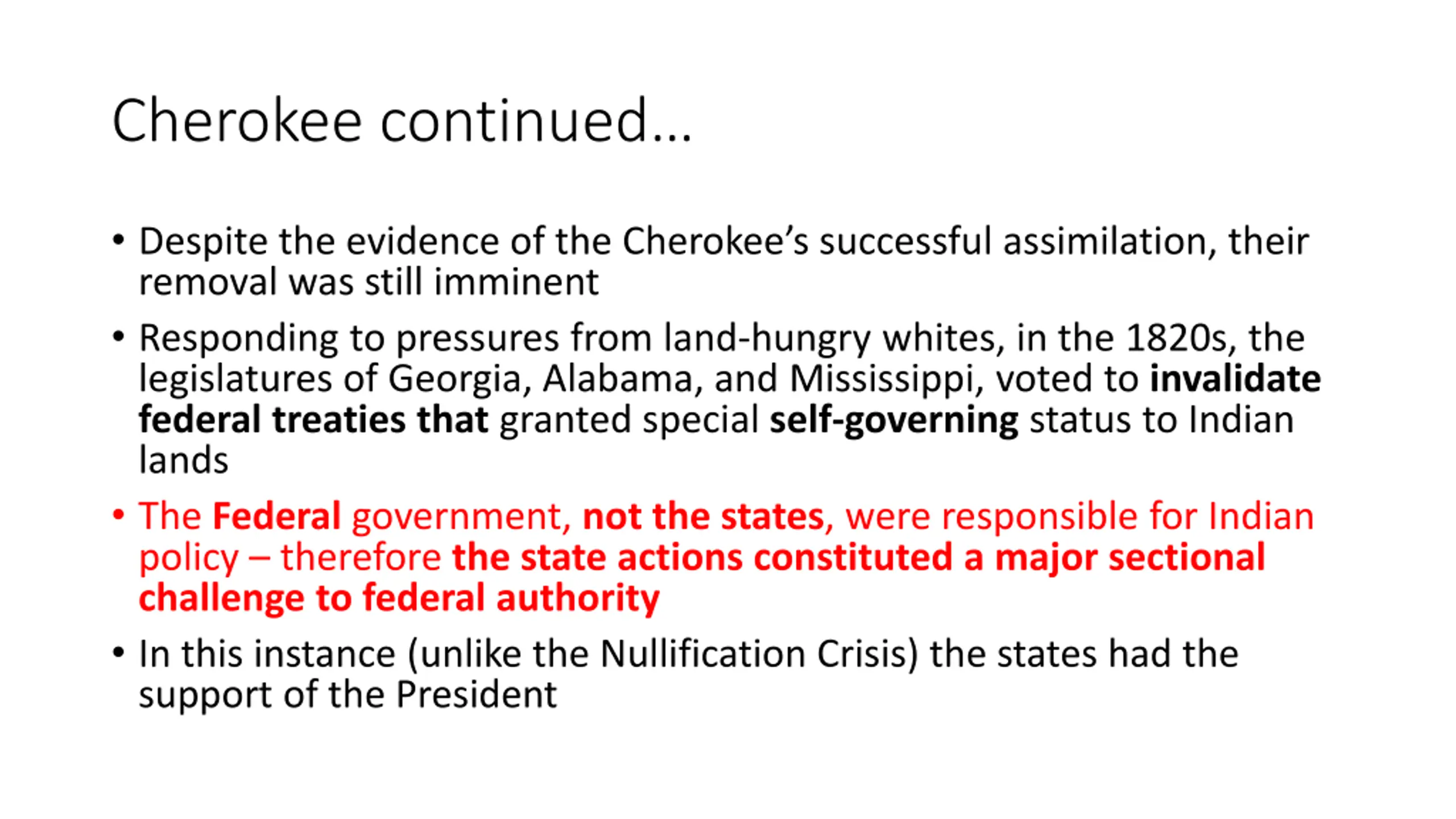 Cherokee continued Despite the evidence of the Cherokee s successful assimilation, their removal was still imminent Responding to pressures from land-hungry whites, in the 1820s, the legislatures of Georgia, Alabama, and Mississippi, voted to invalidate federal treaties that granted special self-governing status to Indian lands The Federal government, not the states, were responsible for Indian policy therefore the state actions constituted a major sectional challenge to federal authority In this instance (unlike the Nullification Crisis) the states had the support of the President