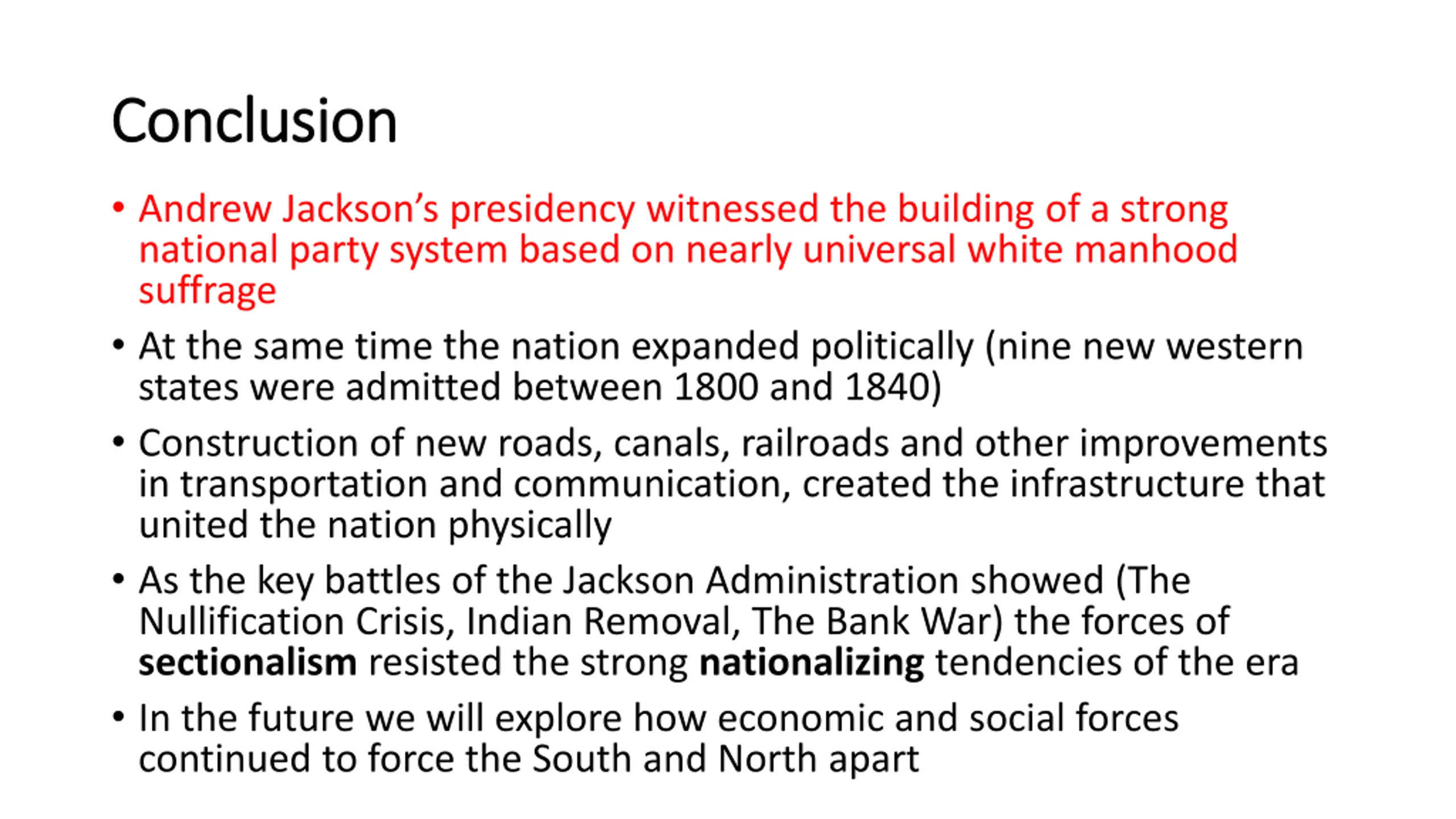 Conclusion Conclusion Andrew Jackson s presidency witnessed the building of a strong national party system based on nearly universal white manhood suffrage At the same time the nation expanded politically (nine new western states were admitted between 1800 and 1840) Construction of new roads, canals, railroads and other improvements in transportation and communication, created the infrastructure that united the nation physically As the key battles of the Jackson Administration showed (The Nullification Crisis, Indian Removal, The Bank War) the forces of sectionalism resisted the strong nationalizing tendencies of the era In the future we will explore how economic and social forces continued to force the South and North apart