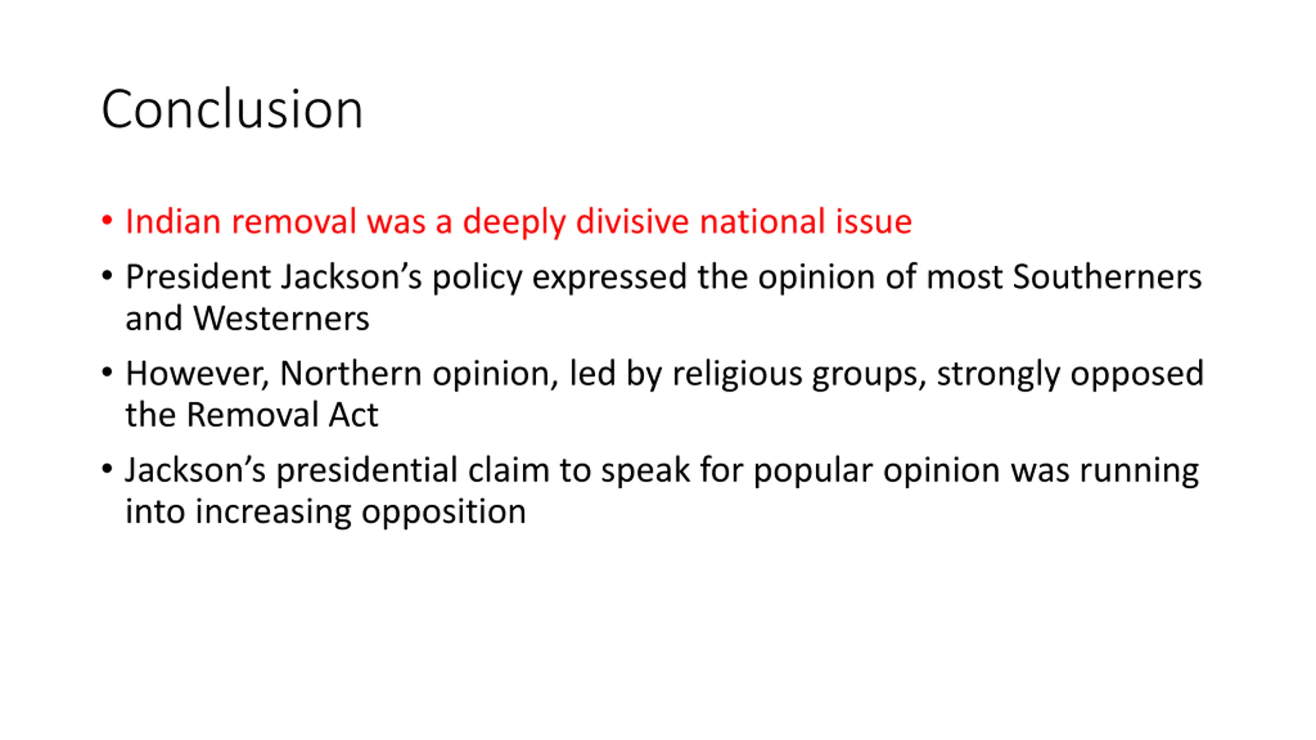 Conclusion Indian removal was a deeply divisive national issue President Jackson s policy expressed the opinion of most Southerners and Westerners However, Northern opinion, led by religious groups, strongly opposed the Removal Act Jackson s presidential claim to speak for popular opinion was running into increasing opposition
