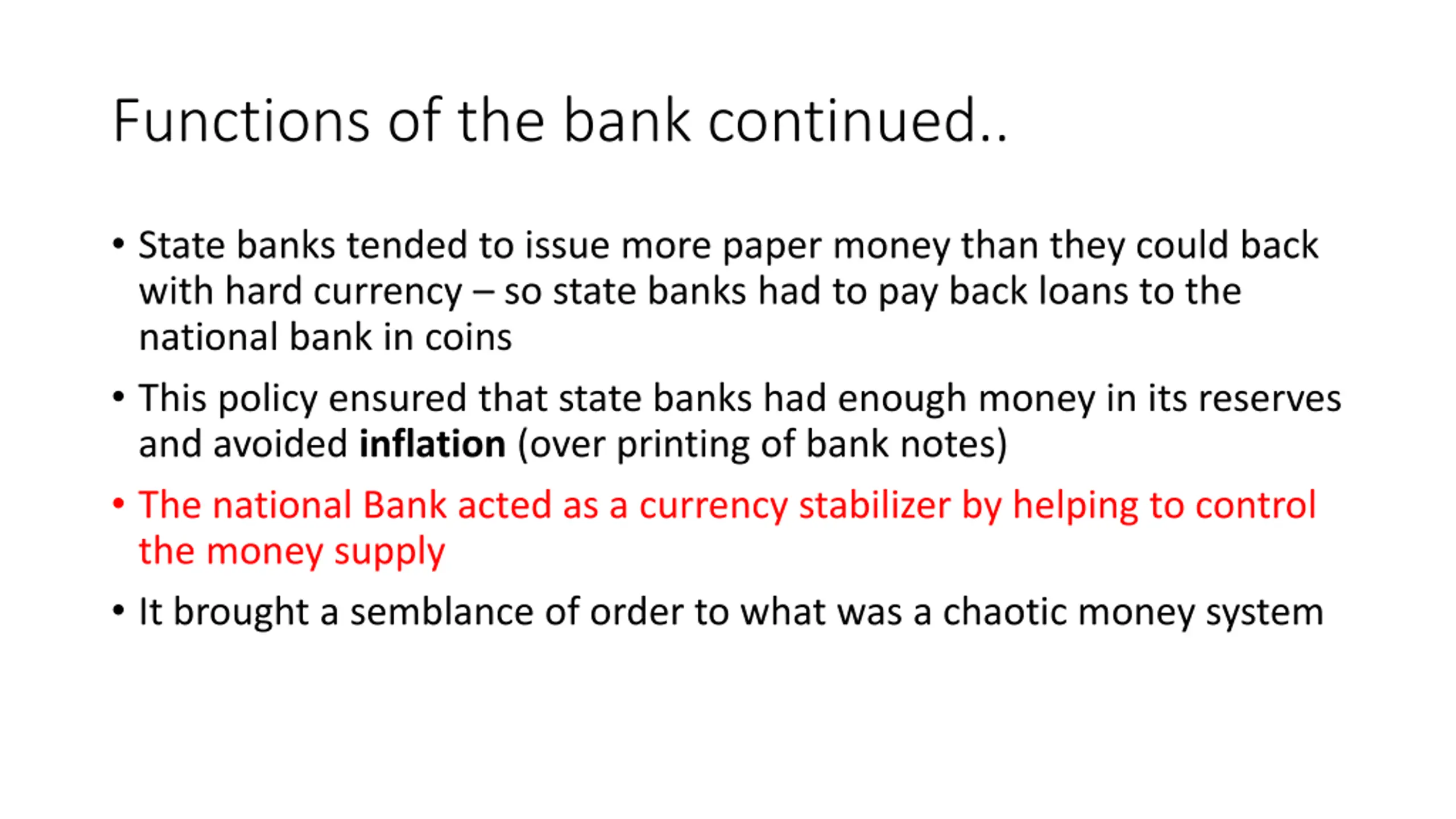 Functions of the bank continued.. State banks tended to issue more paper money than they could back with hard currency so state banks had to pay back loans to the national bank in coins This policy ensured that state banks had enough money in its reserves and avoided inflation (over printing of bank notes) The national Bank acted as a currency stabilizer by helping to control the money supply It brought a semblance of order to what was a chaotic money system