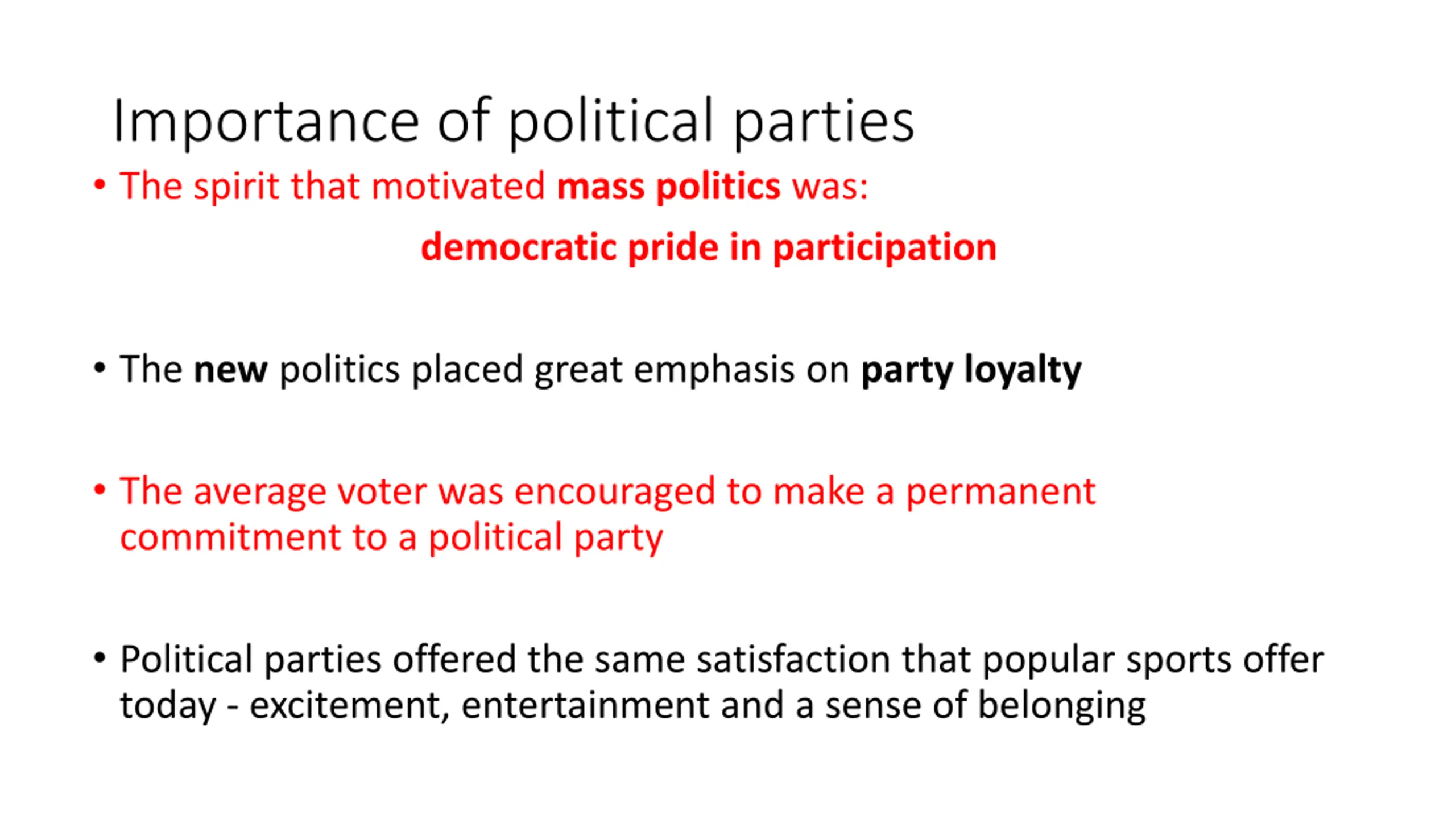 Importance of political parties The spirit that motivated mass politics was: democratic pride in participation The new politics placed great emphasis on party loyalty The average voter was encouraged to make a permanent commitment to a political party Political parties offered the same satisfaction that popular sports offer today - excitement, entertainment and a sense of belonging
