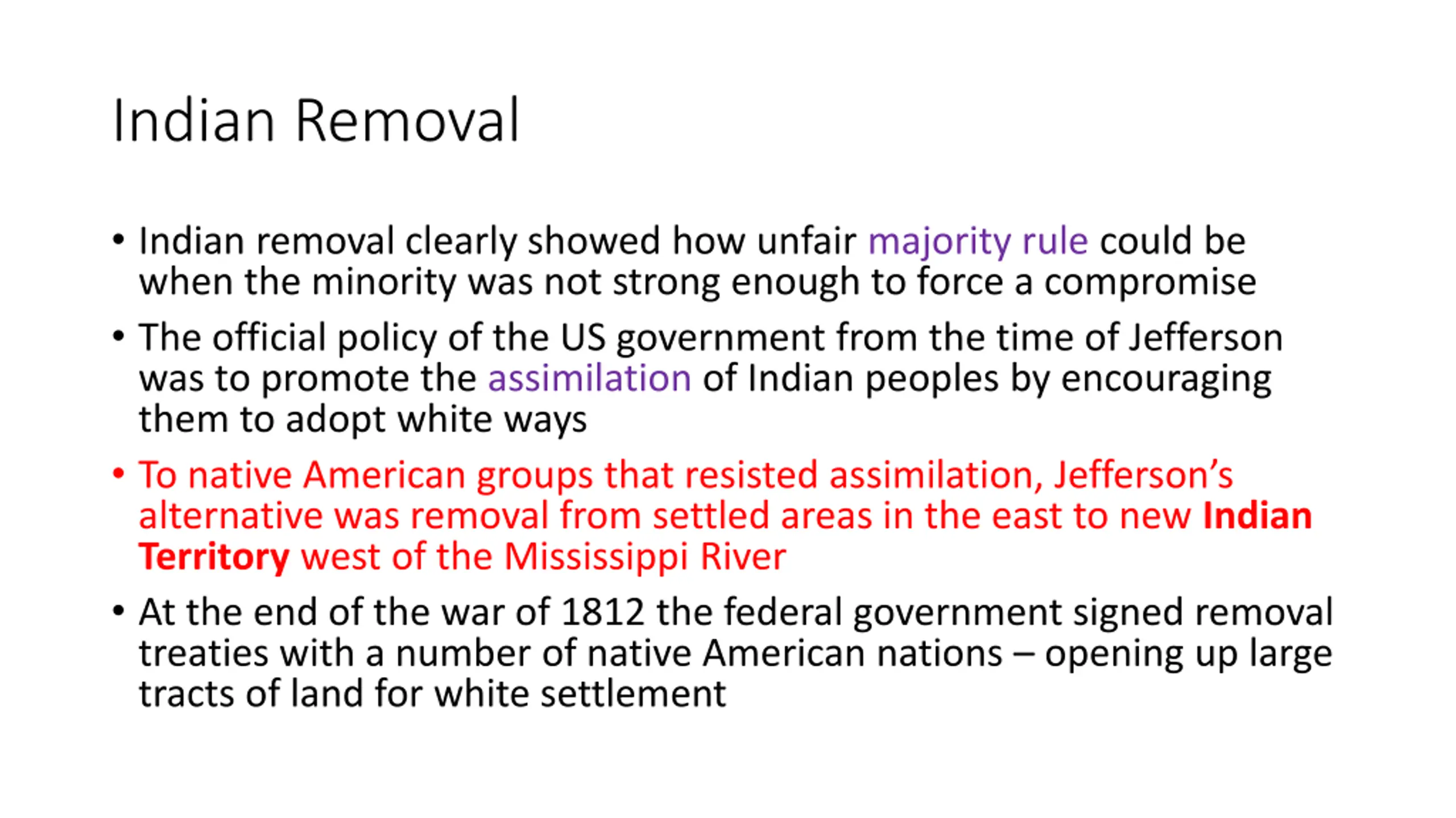 Indian Removal Indian removal clearly showed how unfair majority rule could be when the minority was not strong enough to force a compromise The official policy of the US government from the time of Jefferson was to promote the assimilation of Indian peoples by encouraging them to adopt white ways To native American groups that resisted assimilation, Jefferson s alternative was removal from settled areas in the east to new Indian Territory west of the Mississippi River At the end of the war of 1812 the federal government signed removal treaties with a number of native American nations opening up large tracts of land for white settlement