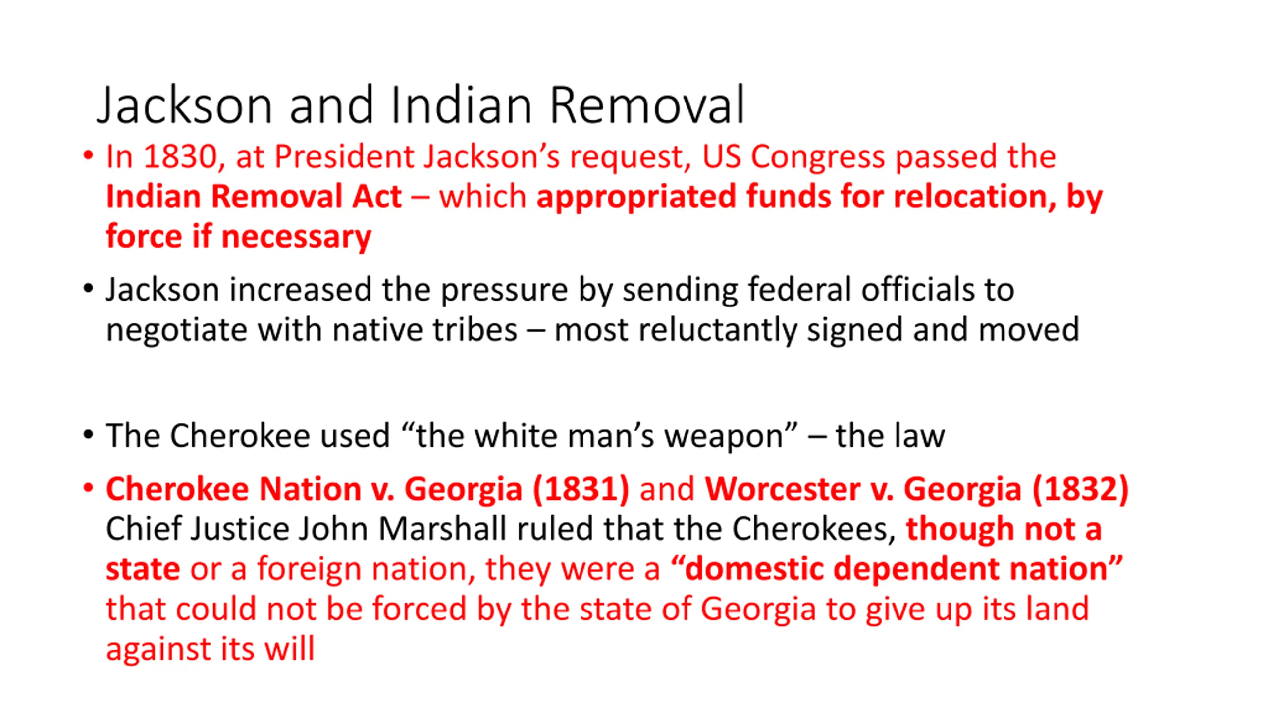 Jackson and Indian Removal In 1830, at President Jackson s request, US Congress passed the Indian Removal Act which appropriated funds for relocation, by force if necessary Jackson increased the pressure by sending federal officials to negotiate with native tribes most reluctantly signed and moved The Cherokee used the white man s weapon the law Cherokee Nation v. Georgia (1831) and Worcester v. Georgia (1832) Chief Justice John Marshall ruled that the Cherokees, though not a state or a foreign nation, they were a domestic dependent nation that could not be forced by the state of Georgia to give up its land against its will