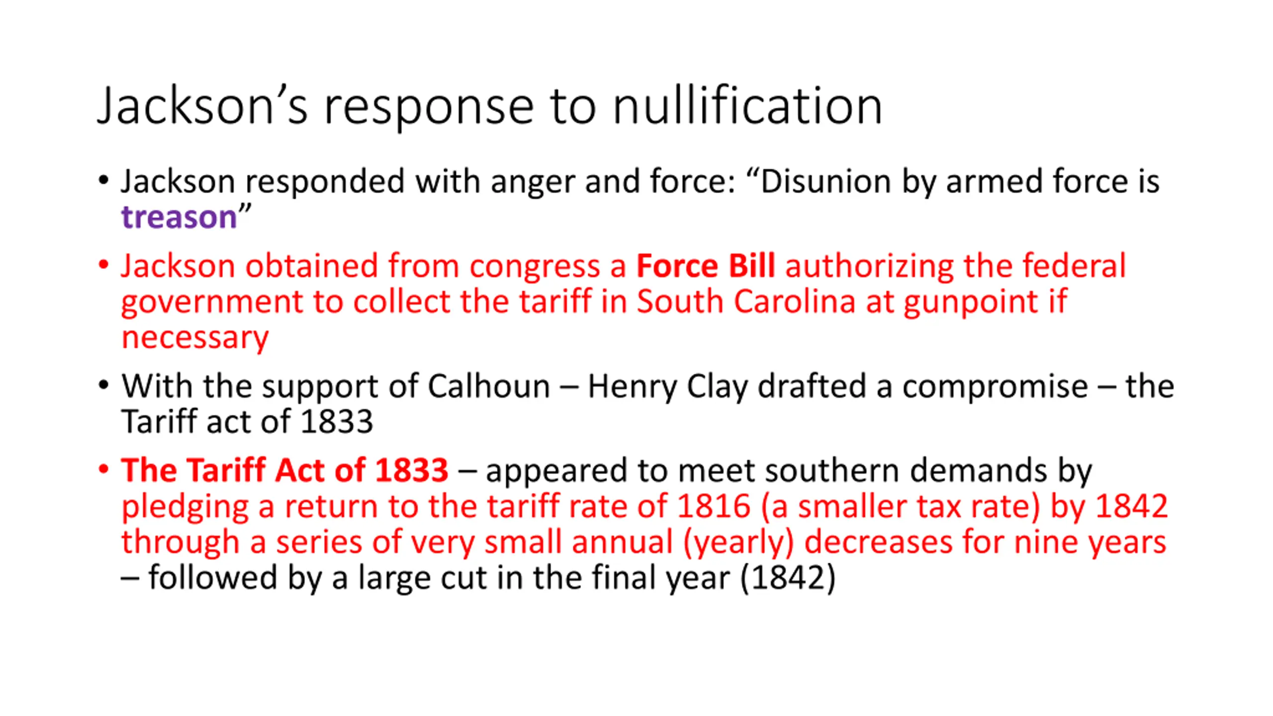 Jacksons response to nullification Jackson responded with anger and force: Disunion by armed force is treason Jackson obtained from congress a Force Bill authorizing the federal government to collect the tariff in South Carolina at gunpoint if necessary With the support of Calhoun Henry Clay drafted a compromise the Tariff act of 1833 The Tariff Act of 1833 appeared to meet southern demands by pledging a return to the tariff rate of 1816 (a smaller tax rate) by 1842 through a series of very small annual (yearly) decreases for nine years followed by a large cut in the final year (1842)