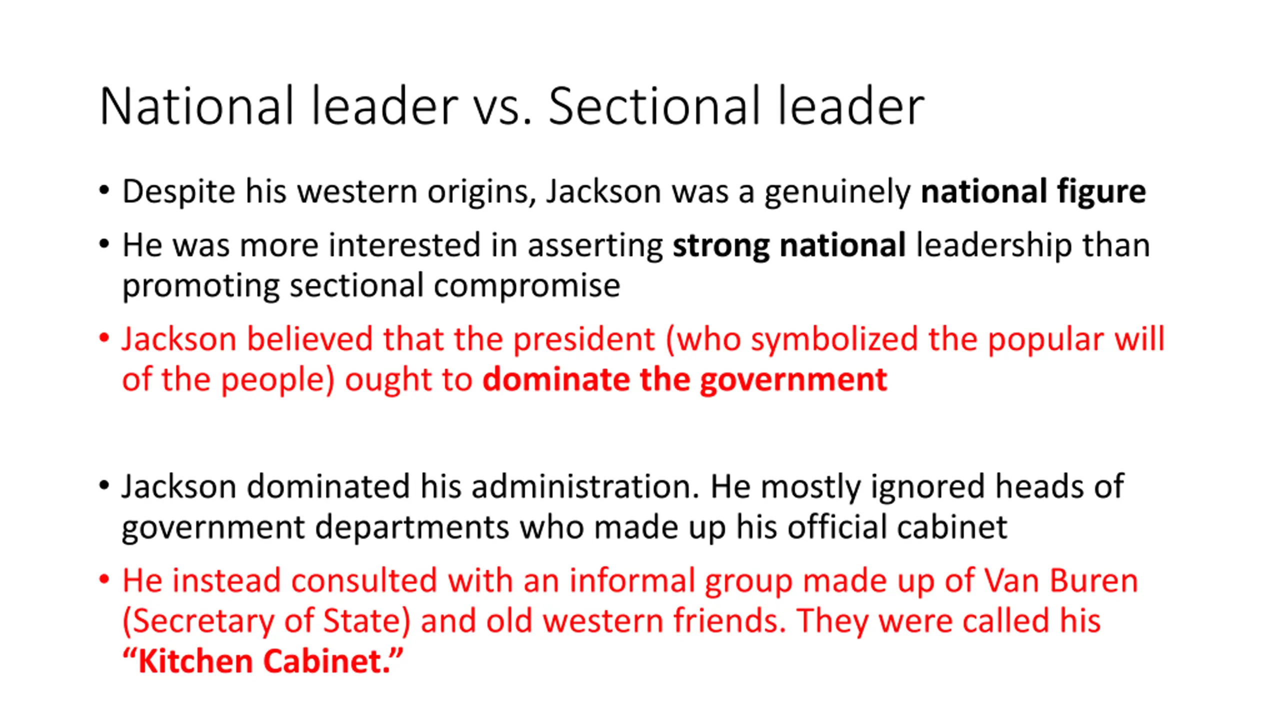 National leader vs. Sectional leader Despite his western origins, Jackson was a genuinely national figure He was more interested in asserting strong national leadership than promoting sectional compromise Jackson believed that the president (who symbolized the popular will of the people) ought to dominate the government Jackson dominated his administration. He mostly ignored heads of government departments who made up his official cabinet He instead consulted with an informal group made up of Van Buren (Secretary of State) and old western friends. They were called his Kitchen Cabinet.
