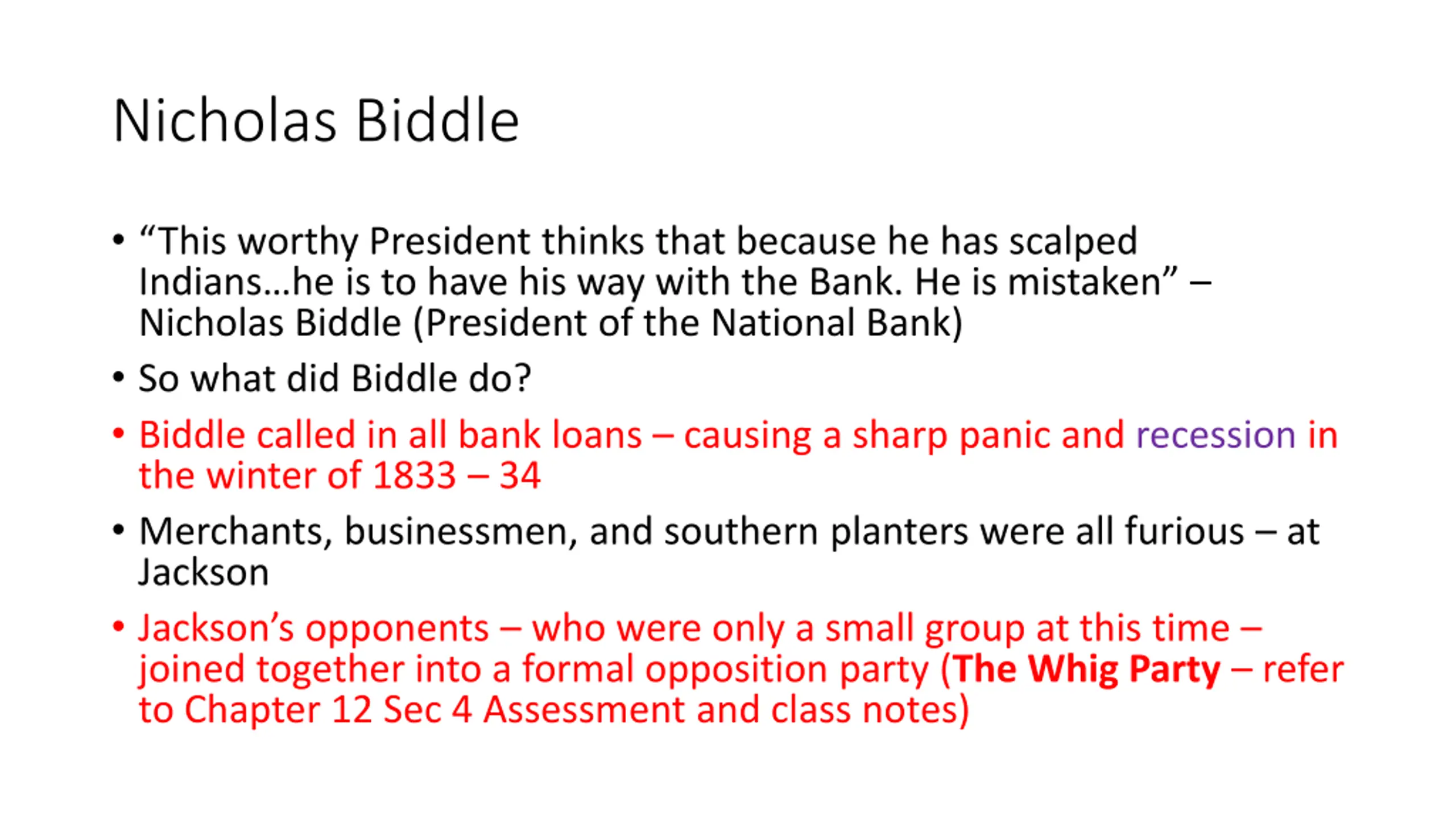 Nicholas Biddle This worthy President thinks that because he has scalped Indians he is to have his way with the Bank. He is mistaken Nicholas Biddle (President of the National Bank) So what did Biddle do? Biddle called in all bank loans causing a sharp panic and recession in the winter of 1833 34 Merchants, businessmen, and southern planters were all furious at Jackson Jackson s opponents who were only a small group at this time joined together into a formal opposition party (The Whig Party refer to Chapter 12 Sec 4 Assessment and class notes)