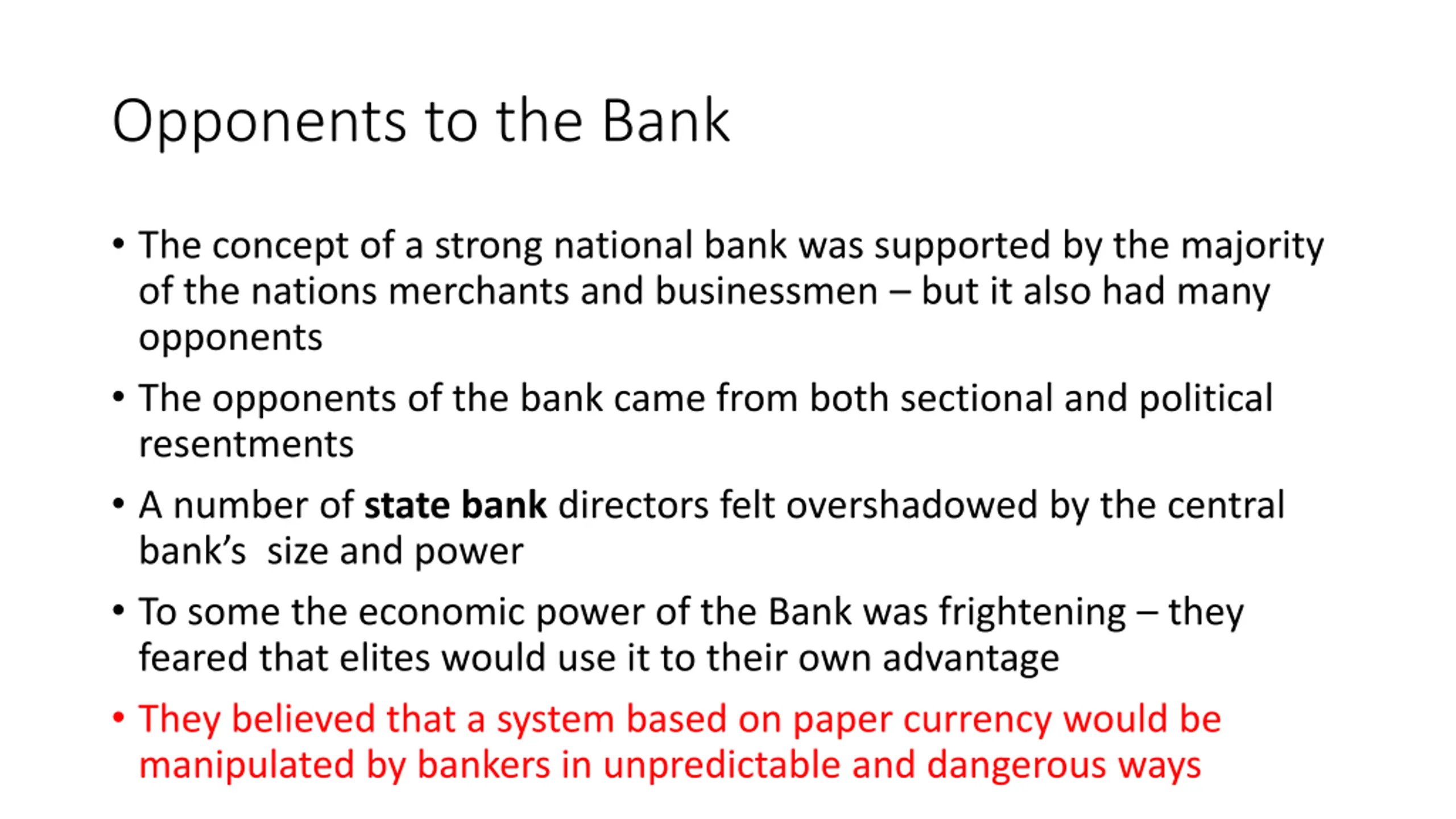 Opponents to the Bank The concept of a strong national bank was supported by the majority of the nations merchants and businessmen but it also had many opponents The opponents of the bank came from both sectional and political resentments A number of state bank directors felt overshadowed by the central bank s size and power To some the economic power of the Bank was frightening they feared that elites would use it to their own advantage They believed that a system based on paper currency would be manipulated by bankers in unpredictable and dangerous ways