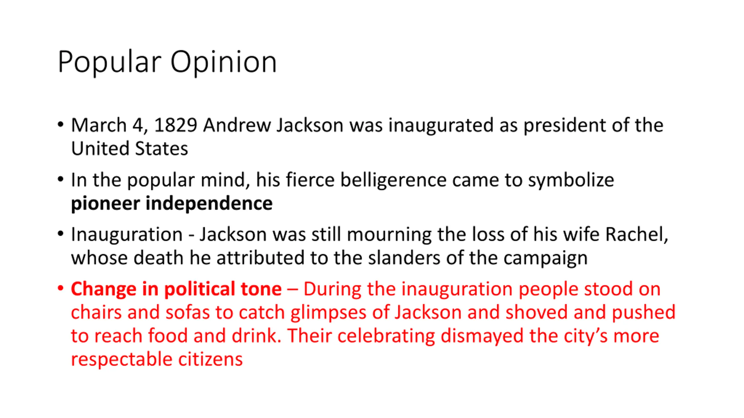 Popular Opinion March 4, 1829 Andrew Jackson was inaugurated as president of the United States In the popular mind, his fierce belligerence came to symbolize pioneer independence Inauguration - Jackson was still mourning the loss of his wife Rachel, whose death he attributed to the slanders of the campaign Change in political tone During the inauguration people stood on chairs and sofas to catch glimpses of Jackson and shoved and pushed to reach food and drink. Their celebrating dismayed the city s more respectable citizens