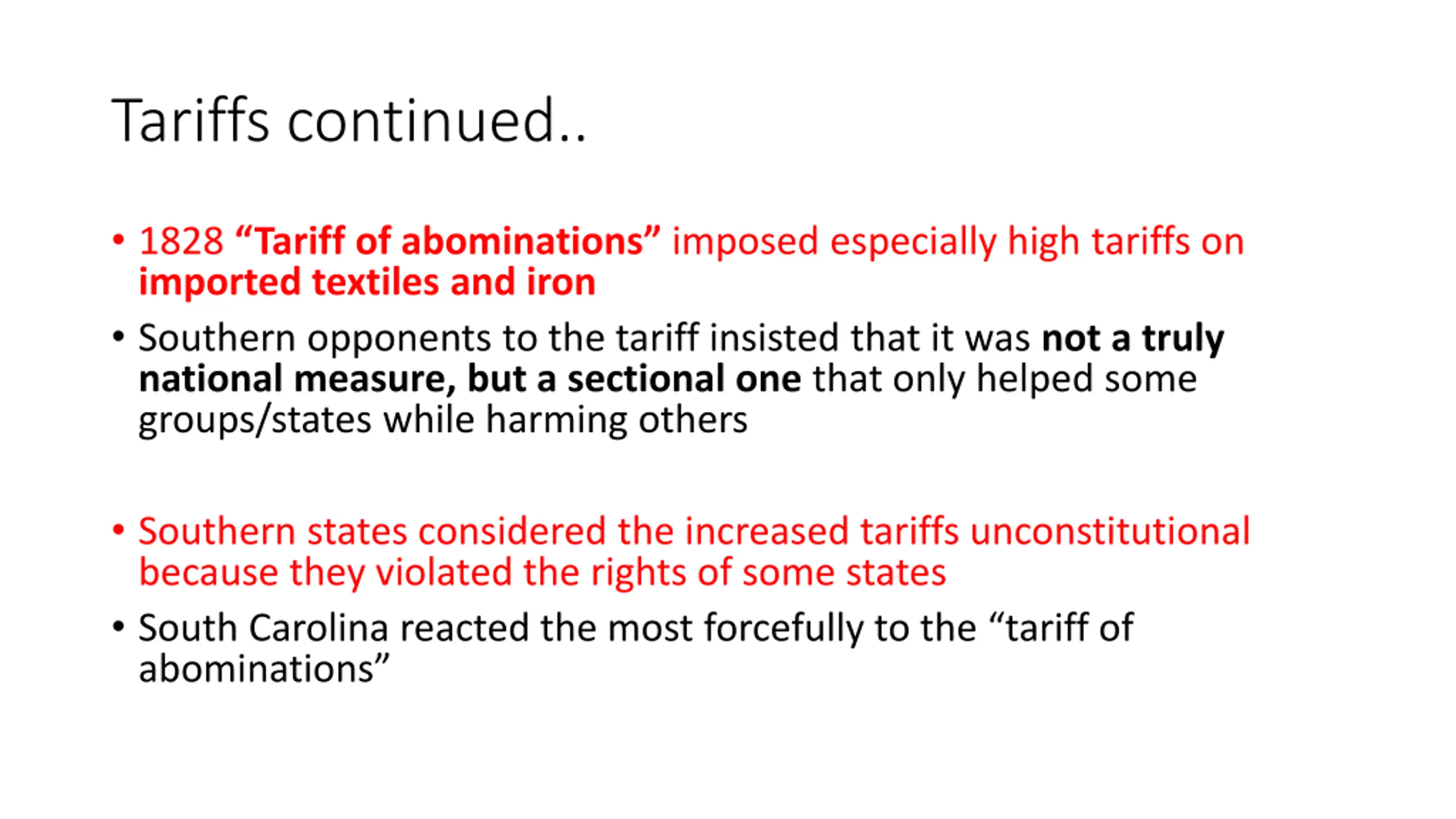 Tariffs continued.. 1828 Tariff of abominations imposed especially high tariffs on imported textiles and iron Southern opponents to the tariff insisted that it was not a truly national measure, but a sectional one that only helped some groups/states while harming others Southern states considered the increased tariffs unconstitutional because they violated the rights of some states South Carolina reacted the most forcefully to the tariff of abominations