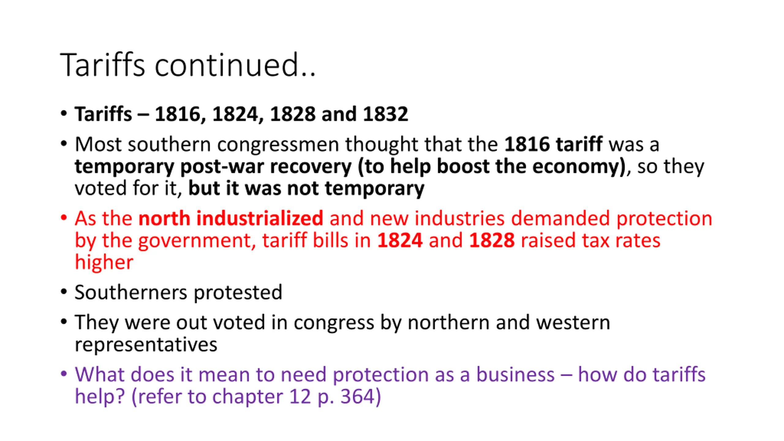Tariffs continued.. Tariffs 1816, 1824, 1828 and 1832 Most southern congressmen thought that the 1816 tariff was a temporary post-war recovery (to help boost the economy), so they voted for it, but it was not temporary As the north industrialized and new industries demanded protection by the government, tariff bills in 1824 and 1828 raised tax rates higher Southerners protested They were out voted in congress by northern and western representatives What does it mean to need protection as a business how do tariffs help? (refer to chapter 12 p. 364)