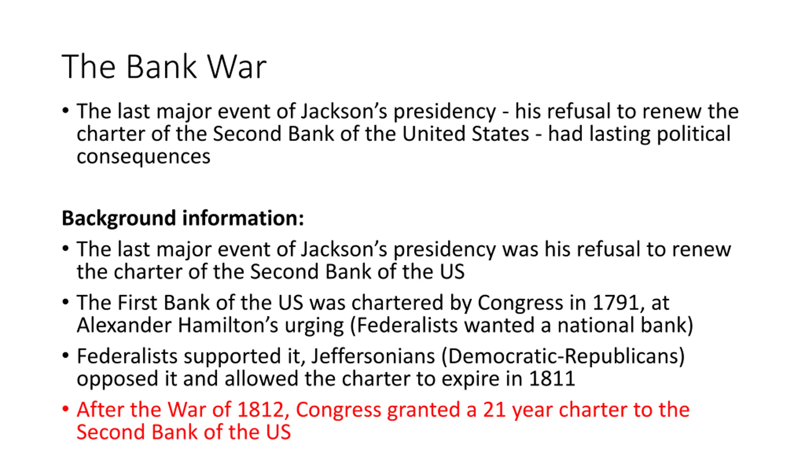 The Bank War The last major event of Jackson s presidency - his refusal to renew the charter of the Second Bank of the United States - had lasting political consequences Background information: The last major event of Jackson s presidency was his refusal to renew the charter of the Second Bank of the US The First Bank of the US was chartered by Congress in 1791, at Alexander Hamilton s urging (Federalists wanted a national bank) Federalists supported it, Jeffersonians (Democratic-Republicans) opposed it and allowed the charter to expire in 1811 After the War of 1812, Congress granted a 21 year charter to the Second Bank of the US