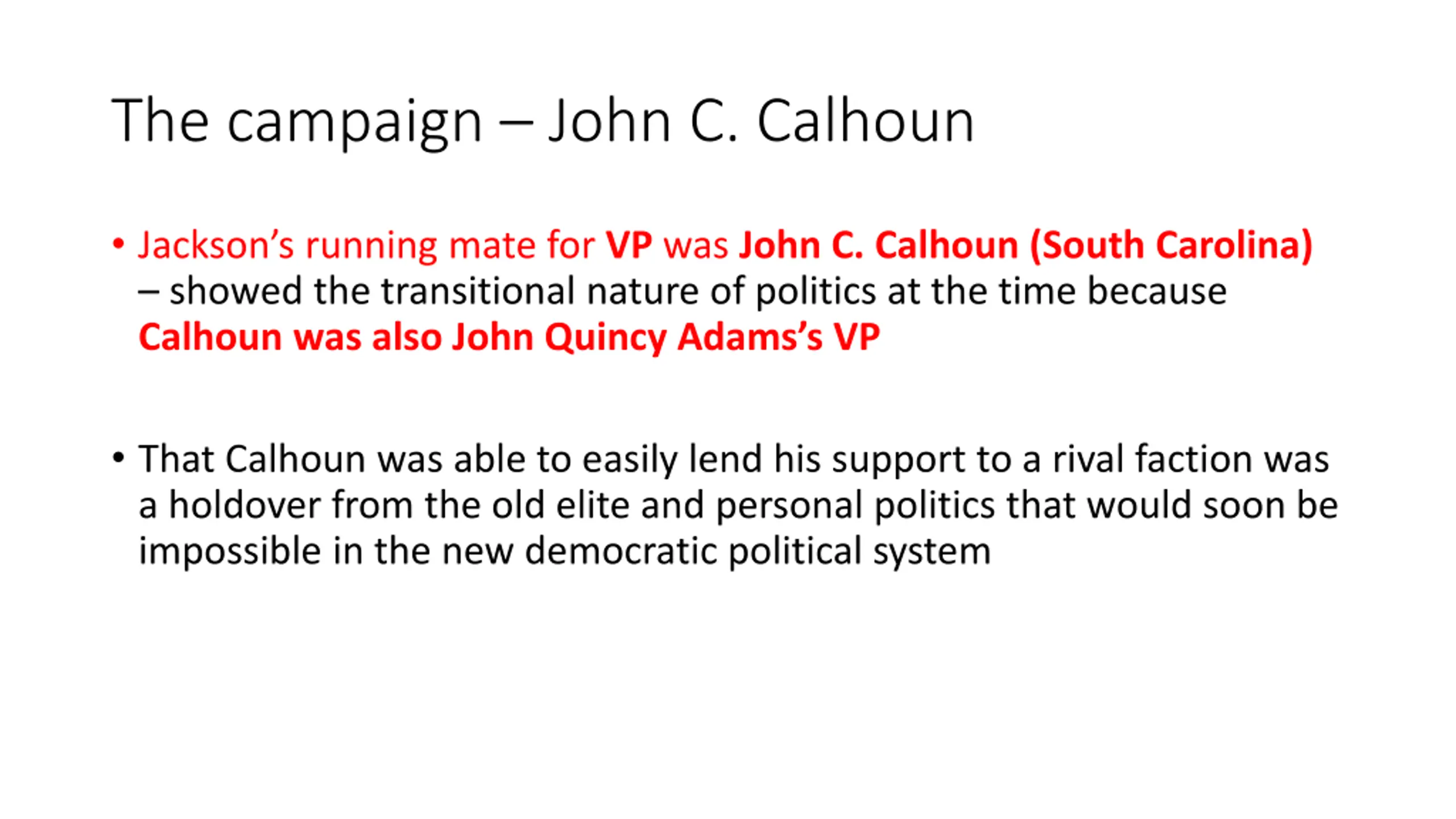 The campaign John C. Calhoun Jackson s running mate for VP was John C. Calhoun (South Carolina) showed the transitional nature of politics at the time because Calhoun was also John Quincy Adams s VP That Calhoun was able to easily lend his support to a rival faction was a holdover from the old elite and personal politics that would soon be impossible in the new democratic political system
