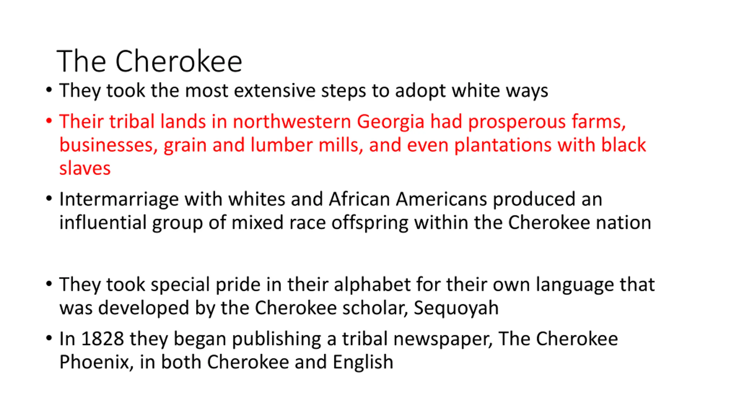 The Cherokee They took the most extensive steps to adopt white ways Their tribal lands in northwestern Georgia had prosperous farms, businesses, grain and lumber mills, and even plantations with black slaves Intermarriage with whites and African Americans produced an influential group of mixed race offspring within the Cherokee nation They took special pride in their alphabet for their own language that was developed by the Cherokee scholar, Sequoyah In 1828 they began publishing a tribal newspaper, The Cherokee Phoenix, in both Cherokee and English