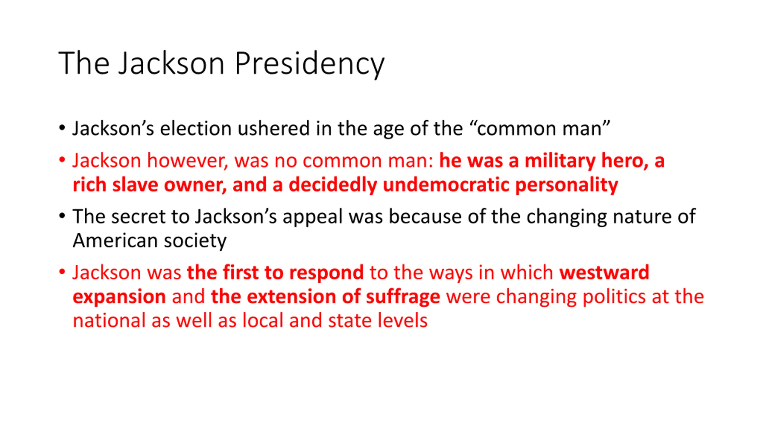The Jackson Presidency Jackson s election ushered in the age of the common man Jackson however, was no common man: he was a military hero, a rich slave owner, and a decidedly undemocratic personality The secret to Jackson s appeal was because of the changing nature of American society Jackson was the first to respond to the ways in which westward expansion and the extension of suffrage were changing politics at the national as well as local and state levels