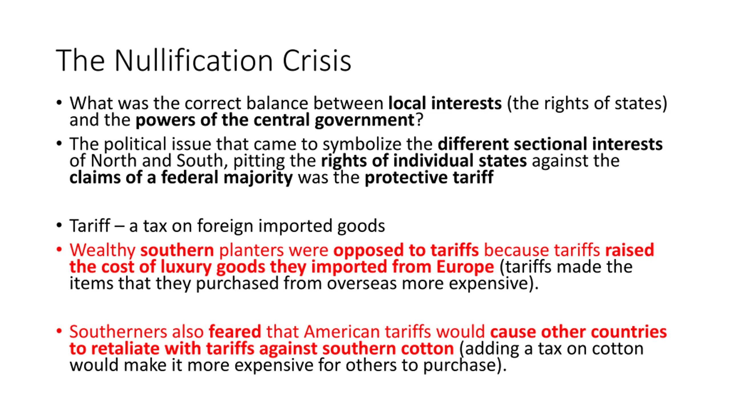 The Nullification Crisis What was the correct balance between local interests (the rights of states) and the powers of the central government? The political issue that came to symbolize the different sectional interests of North and South, pitting the rights of individual states against the claims of a federal majority was the protective tariff Tariff a tax on foreign imported goods Wealthy southern planters were opposed to tariffs because tariffs raised the cost of luxury goods they imported from Europe (tariffs made the items that they purchased from overseas more expensive). Southerners also feared that American tariffs would cause other countries to retaliate with tariffs against southern cotton (adding a tax on cotton would make it more expensive for others to purchase).