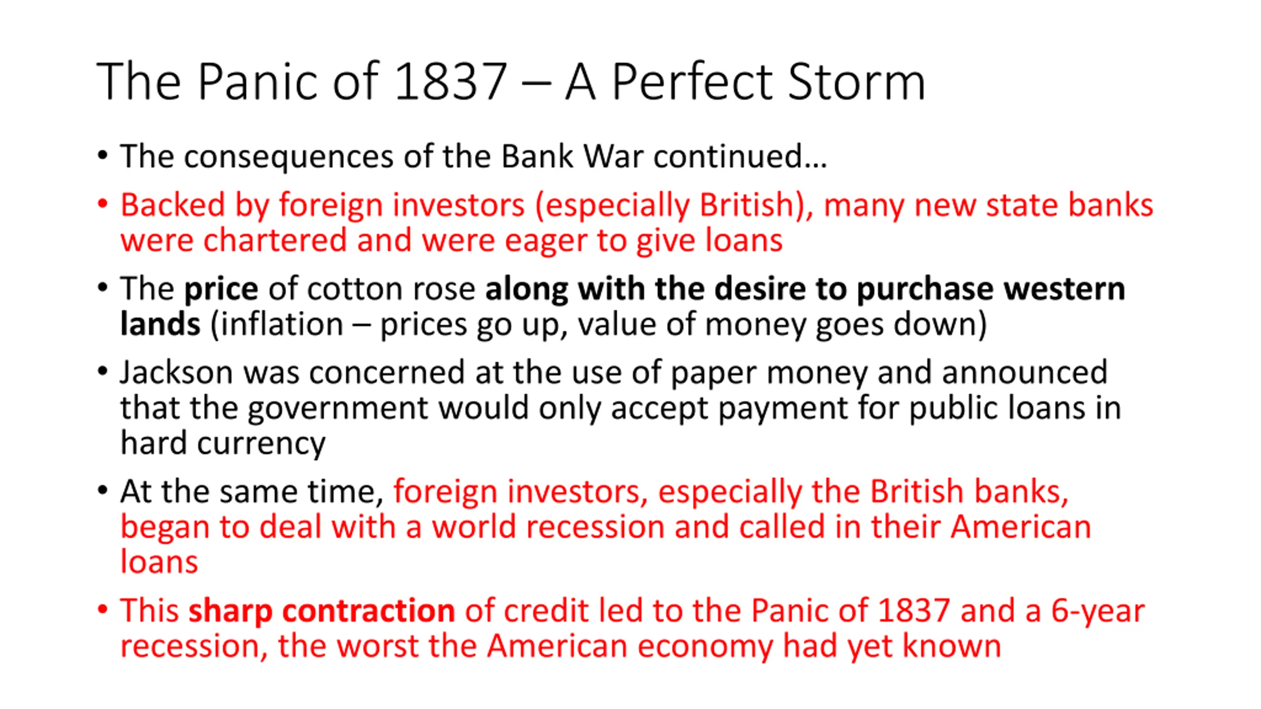 The Panic of 1837 A Perfect Storm The consequences of the Bank War continued Backed by foreign investors (especially British), many new state banks were chartered and were eager to give loans The price of cotton rose along with the desire to purchase western lands (inflation prices go up, value of money goes down) Jackson was concerned at the use of paper money and announced that the government would only accept payment for public loans in hard currency At the same time, foreign investors, especially the British banks, began to deal with a world recession and called in their American loans This sharp contraction of credit led to the Panic of 1837 and a 6-year recession, the worst the American economy had yet known