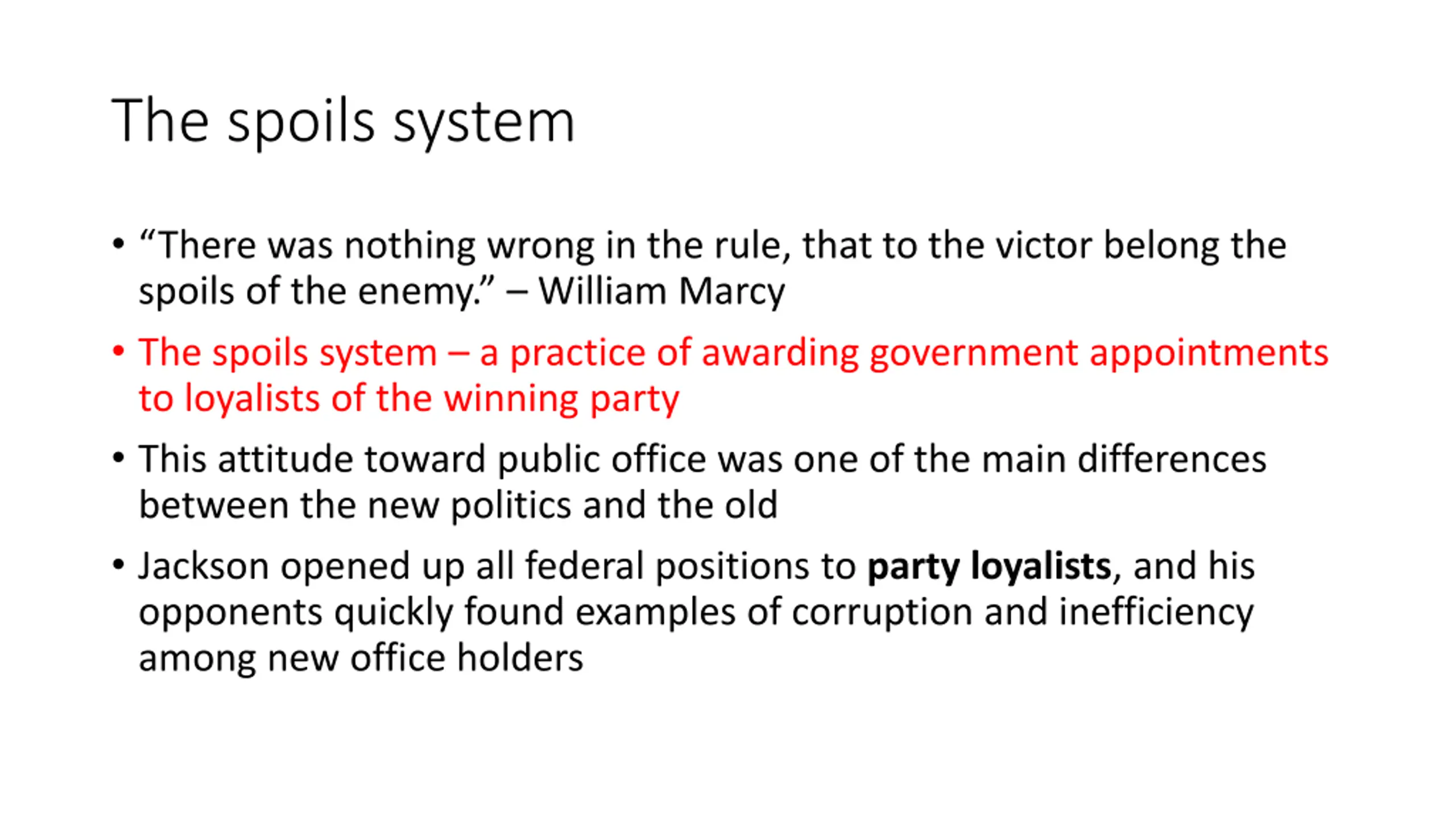 The spoils system There was nothing wrong in the rule, that to the victor belong the spoils of the enemy. William Marcy The spoils system a practice of awarding government appointments to loyalists of the winning party This attitude toward public office was one of the main differences between the new politics and the old Jackson opened up all federal positions to party loyalists, and his opponents quickly found examples of corruption and inefficiency among new office holders