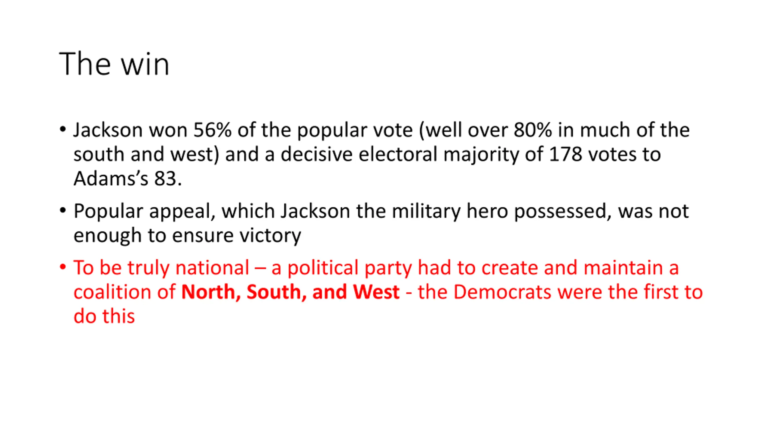 The win Jackson won 56% of the popular vote (well over 80% in much of the south and west) and a decisive electoral majority of 178 votes to Adams s 83. Popular appeal, which Jackson the military hero possessed, was not enough to ensure victory To be truly national a political party had to create and maintain a coalition of North, South, and West - the Democrats were the first to do this