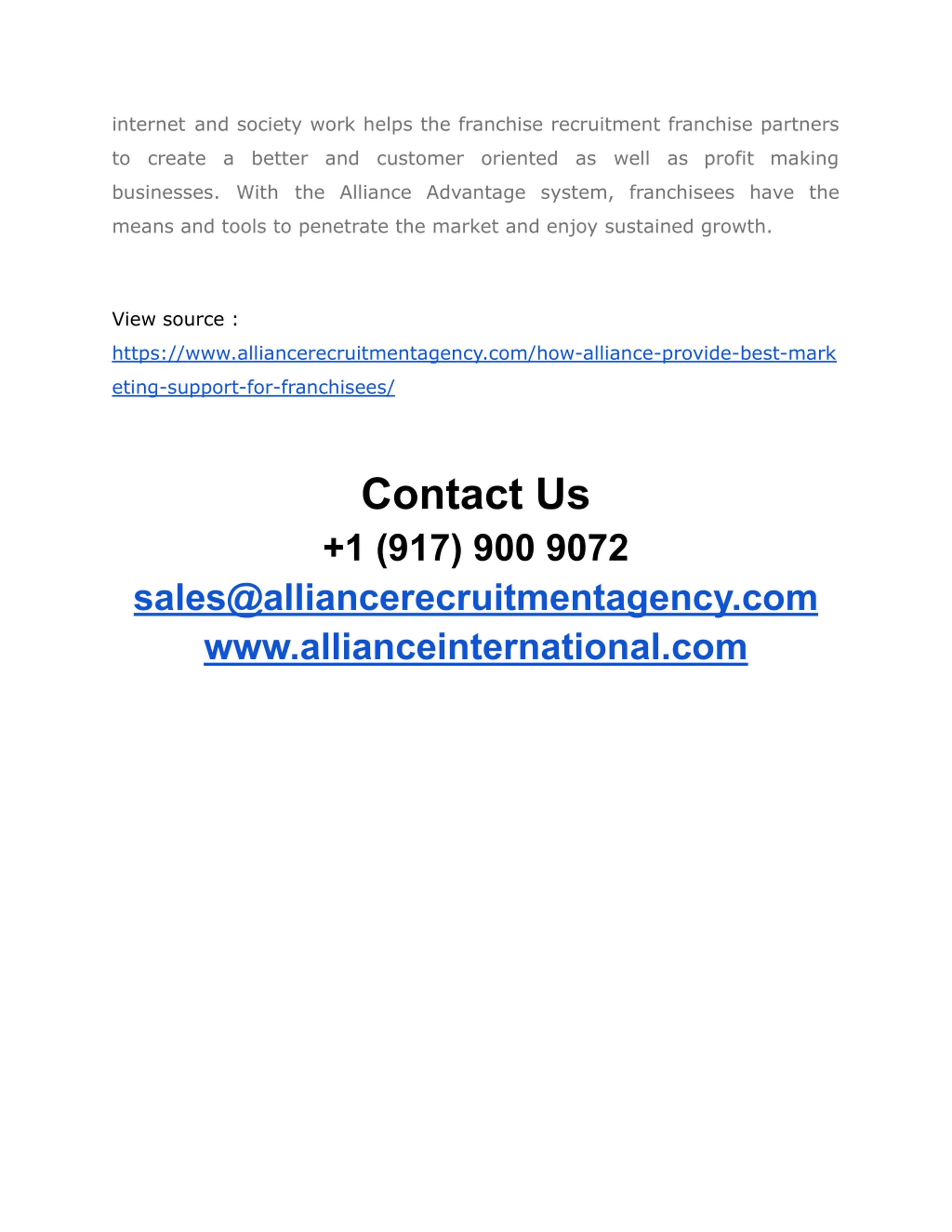 internet and society work helps the franchise recruitment franchise partners to create a better and customer oriented as well as profit making businesses. With the Alliance Advantage system, franchisees have the means and tools to penetrate the market and enjoy sustained growth. View source : https://www.alliancerecruitmentagency.com/how-alliance-provide-best-mark eting-support-for-franchisees/ Contact Us +1 (917) 900 9072 sales@alliancerecruitmentagency.com www.allianceinternational.com