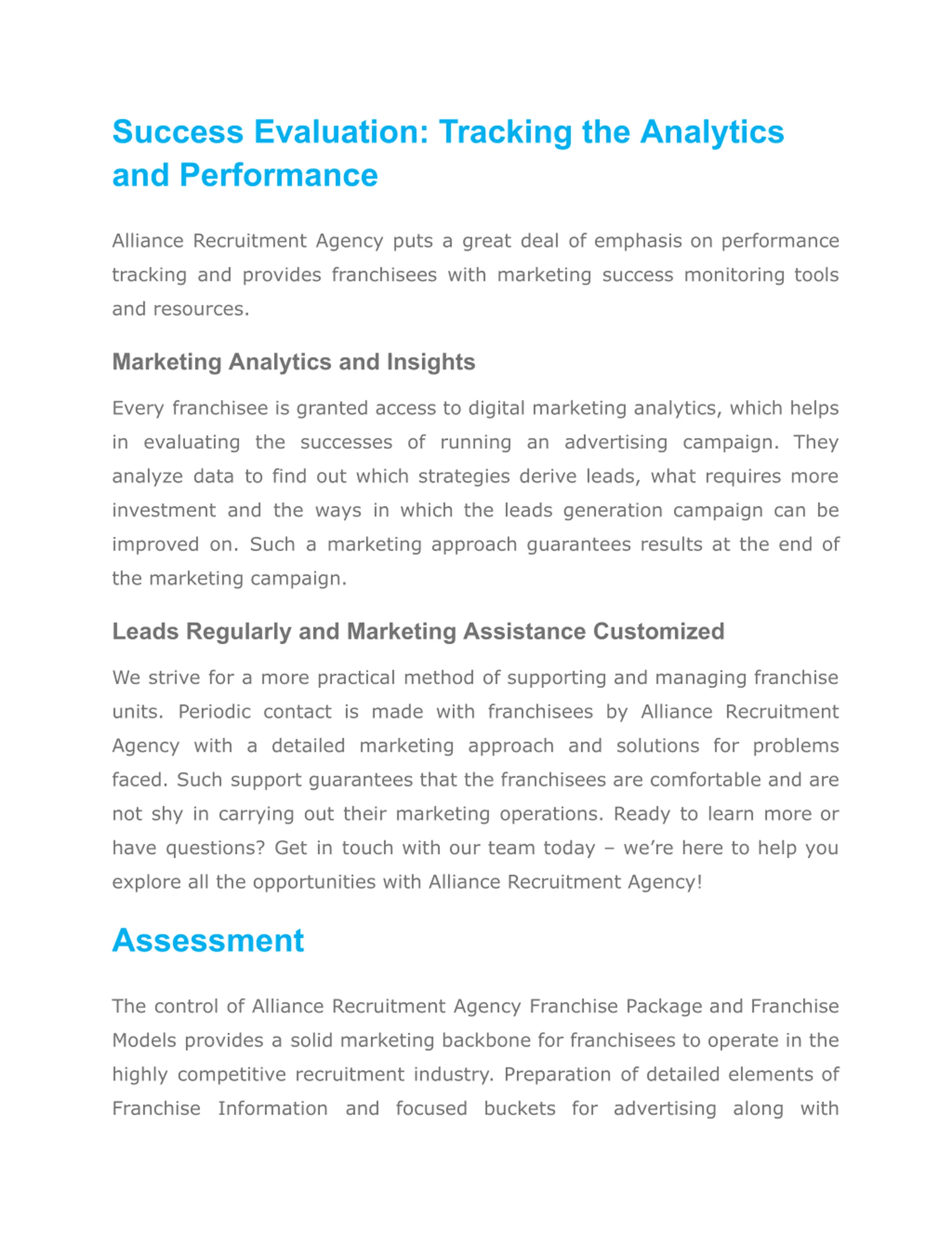 Success Evaluation: Tracking the Analytics and Performance Alliance Recruitment Agency puts a great deal of emphasis on performance tracking and provides franchisees with marketing success monitoring tools and resources. Marketing Analytics and Insights Every franchisee is granted access to digital marketing analytics, which helps in evaluating the successes of running an advertising campaign. They analyze data to find out which strategies derive leads, what requires more investment and the ways in which the leads generation campaign can be improved on. Such a marketing approach guarantees results at the end of the marketing campaign. Leads Regularly and Marketing Assistance Customized We strive for a more practical method of supporting and managing franchise units. Periodic contact is made with franchisees by Alliance Recruitment Agency with a detailed marketing approach and solutions for problems faced. Such support guarantees that the franchisees are comfortable and are not shy in carrying out their marketing operations. Ready to learn more or have questions? Get in touch with our team today we re here to help you explore all the opportunities with Alliance Recruitment Agency! Assessment The control of Alliance Recruitment Agency Franchise Package and Franchise Models provides a solid marketing backbone for franchisees to operate in the highly competitive recruitment industry. Preparation of detailed elements of Franchise Information and focused buckets for advertising along with