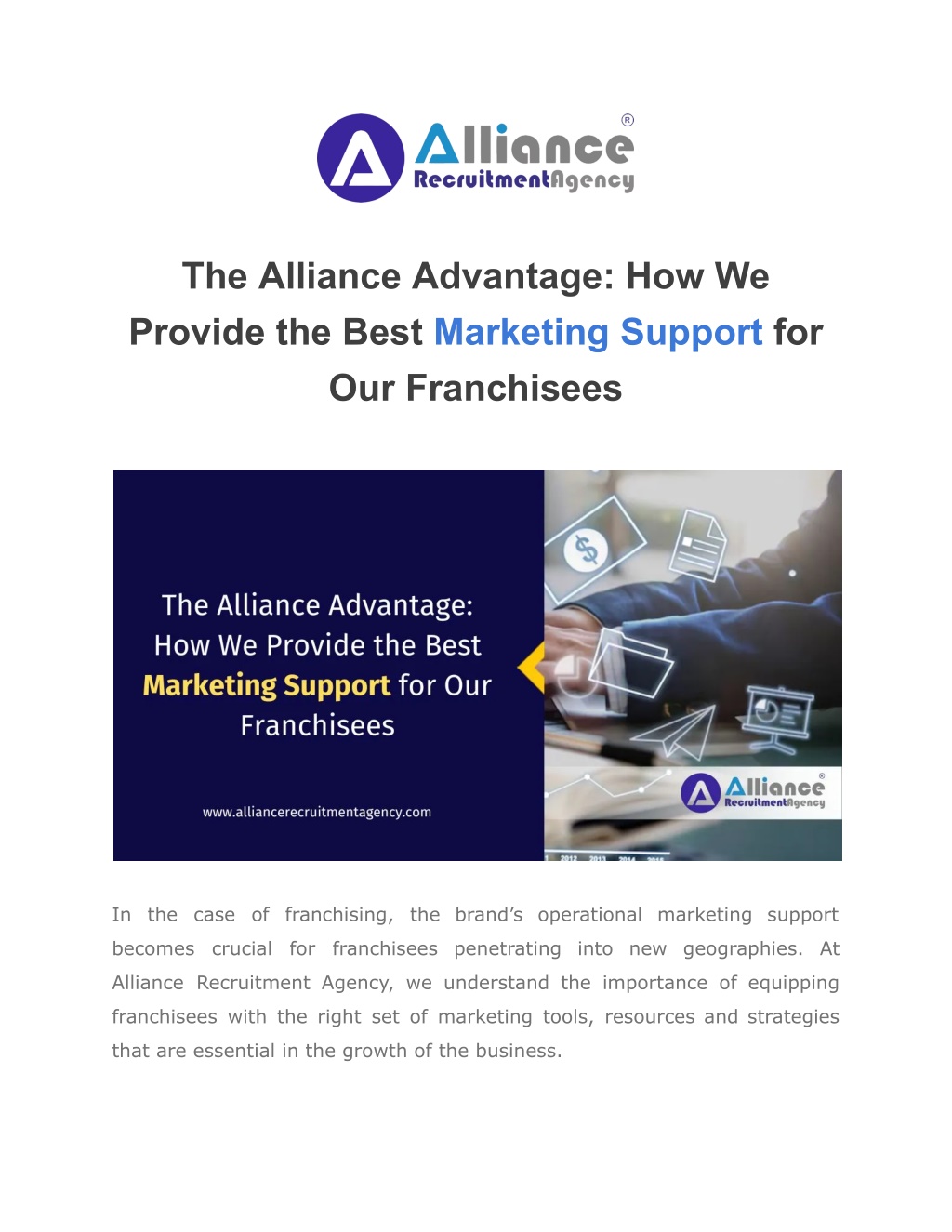 The Alliance Advantage: How We Provide the Best Marketing Support for Our Franchisees In the case of franchising, the brand s operational marketing support becomes crucial for franchisees penetrating into new geographies. At Alliance Recruitment Agency, we understand the importance of equipping franchisees with the right set of marketing tools, resources and strategies that are essential in the growth of the business.