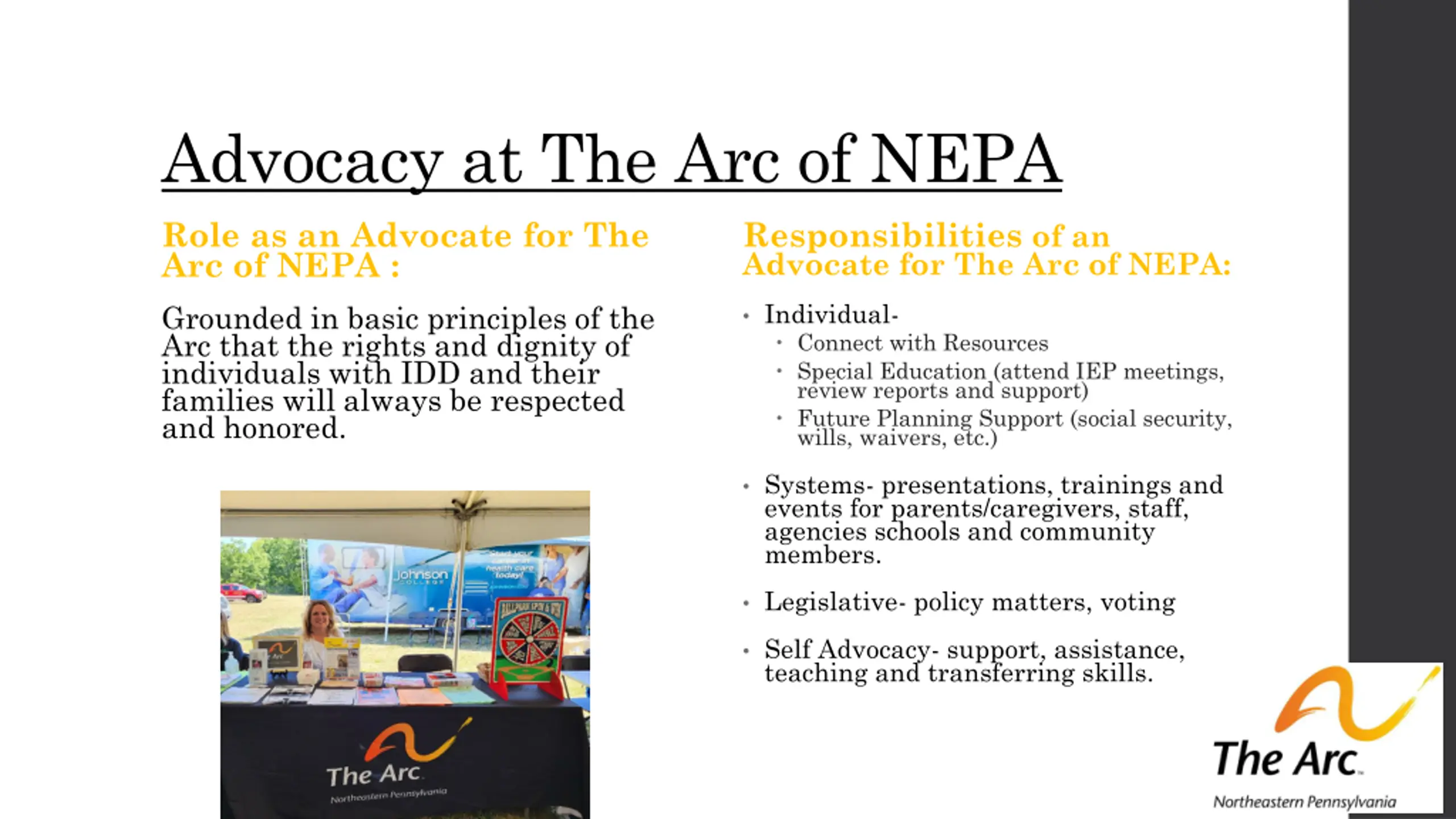 Advocacy at The Arc of NEPA Role as an Advocate for The Arc of NEPA : Grounded in basic principles of the Arc that the rights and dignity of individuals with IDD and their families will always be respected and honored. Responsibilities of an Advocate for The Arc of NEPA: Individual- Connect with Resources Special Education (attend IEP meetings, review reports and support) Future Planning Support (social security, wills, waivers, etc.) Systems- presentations, trainings and events for parents/caregivers, staff, agencies schools and community members. Legislative- policy matters, voting Self Advocacy- support, assistance, teaching and transferring skills.