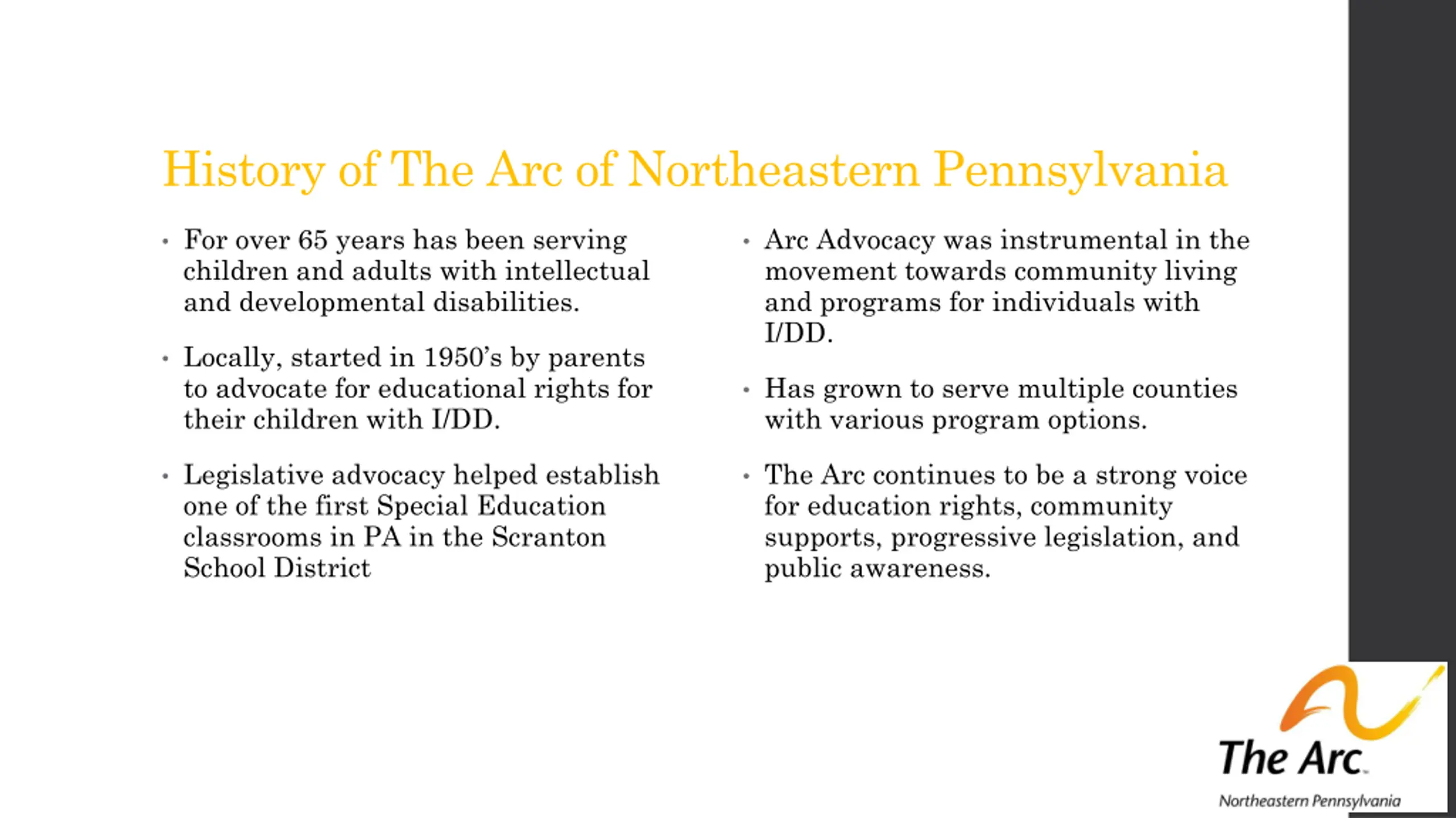 History of The Arc of Northeastern Pennsylvania For over 65 years has been serving children and adults with intellectual and developmental disabilities. Arc Advocacy was instrumental in the movement towards community living and programs for individuals with I/DD. Locally, started in 1950 s by parents to advocate for educational rights for their children with I/DD. Has grown to serve multiple counties with various program options. Legislative advocacy helped establish one of the first Special Education classrooms in PA in the Scranton School District The Arc continues to be a strong voice for education rights, community supports, progressive legislation, and public awareness.