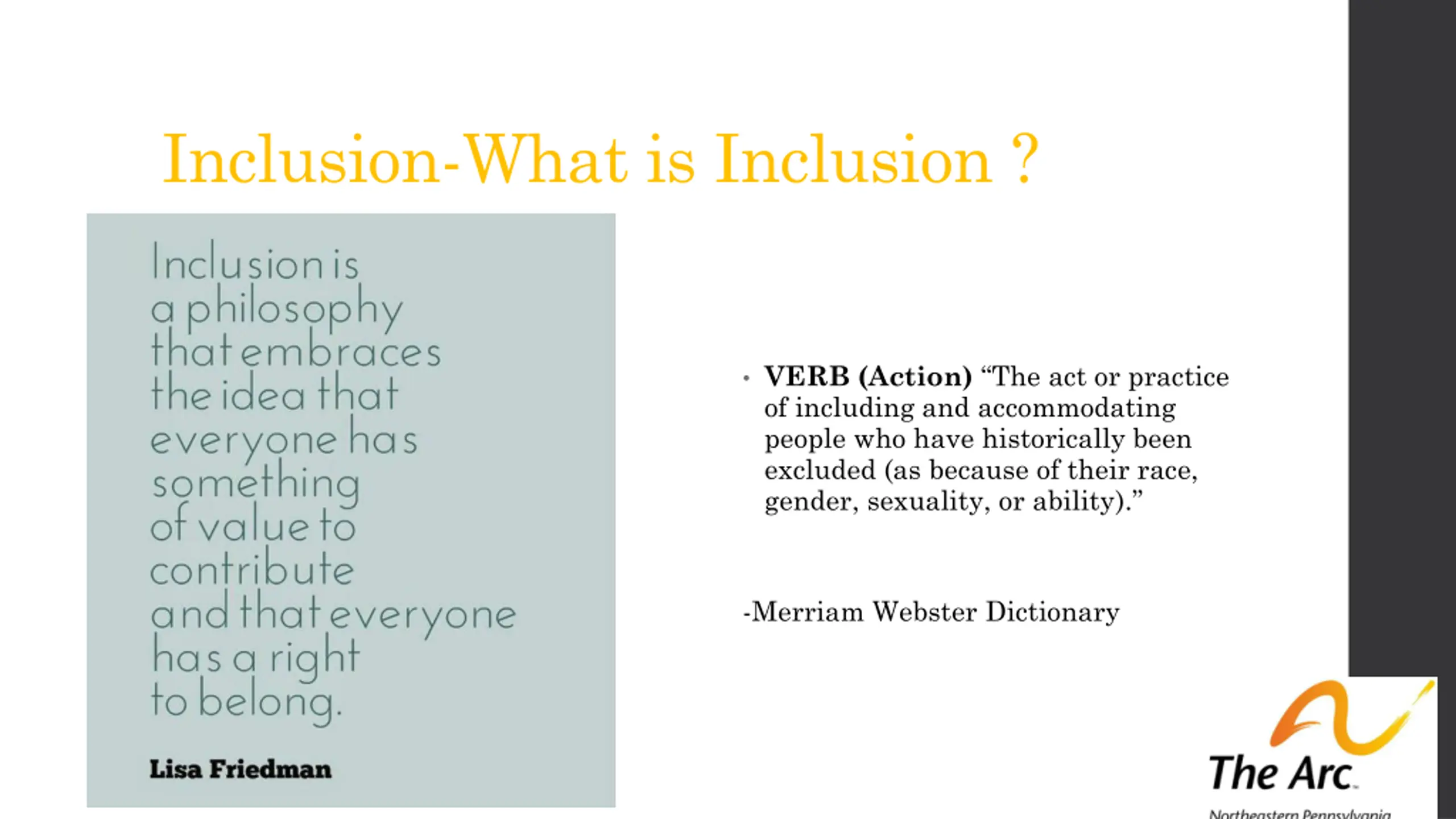 Inclusion-What is Inclusion ? VERB (Action) The act or practice of including and accommodating people who have historically been excluded (as because of their race, gender, sexuality, or ability). -Merriam Webster Dictionary