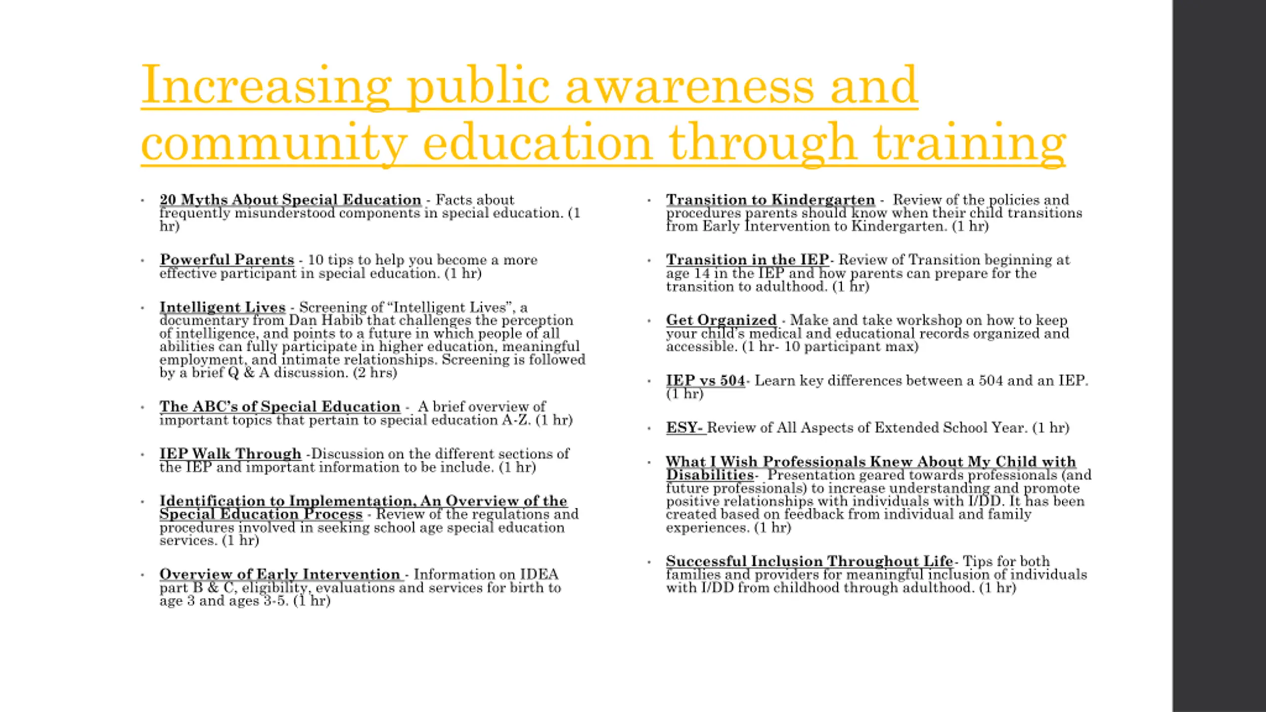 Increasing public awareness and community education through training 20 Myths About Special Education - Facts about frequently misunderstood components in special education. (1 hr) Transition to Kindergarten - Review of the policies and procedures parents should know when their child transitions from Early Intervention to Kindergarten. (1 hr) Powerful Parents - 10 tips to help you become a more effective participant in special education. (1 hr) Transition in the IEP- Review of Transition beginning at age 14 in the IEP and how parents can prepare for the transition to adulthood. (1 hr) Intelligent Lives - Screening of Intelligent Lives , a documentary from Dan Habib that challenges the perception of intelligence, and points to a future in which people of all abilities can fully participate in higher education, meaningful employment, and intimate relationships. Screening is followed by a brief Q & A discussion. (2 hrs) Get Organized - Make and take workshop on how to keep your child s medical and educational records organized and accessible. (1 hr- 10 participant max) IEP vs 504- Learn key differences between a 504 and an IEP. (1 hr) The ABC s of Special Education - A brief overview of important topics that pertain to special education A-Z. (1 hr) ESY- Review of All Aspects of Extended School Year. (1 hr) IEP Walk Through -Discussion on the different sections of the IEP and important information to be include. (1 hr) What I Wish Professionals Knew About My Child with Disabilities- Presentation geared towards professionals (and future professionals) to increase understanding and promote positive relationships with individuals with I/DD. It has been created based on feedback from individual and family experiences. (1 hr) Identification to Implementation, An Overview of the Special Education Process - Review of the regulations and procedures involved in seeking school age special education services. (1 hr) Successful Inclusion Throughout Life- Tips for both families and providers for meaningful inclusion of individuals with I/DD from childhood through adulthood. (1 hr) Overview of Early Intervention - Information on IDEA part B & C, eligibility, evaluations and services for birth to age 3 and ages 3-5. (1 hr)