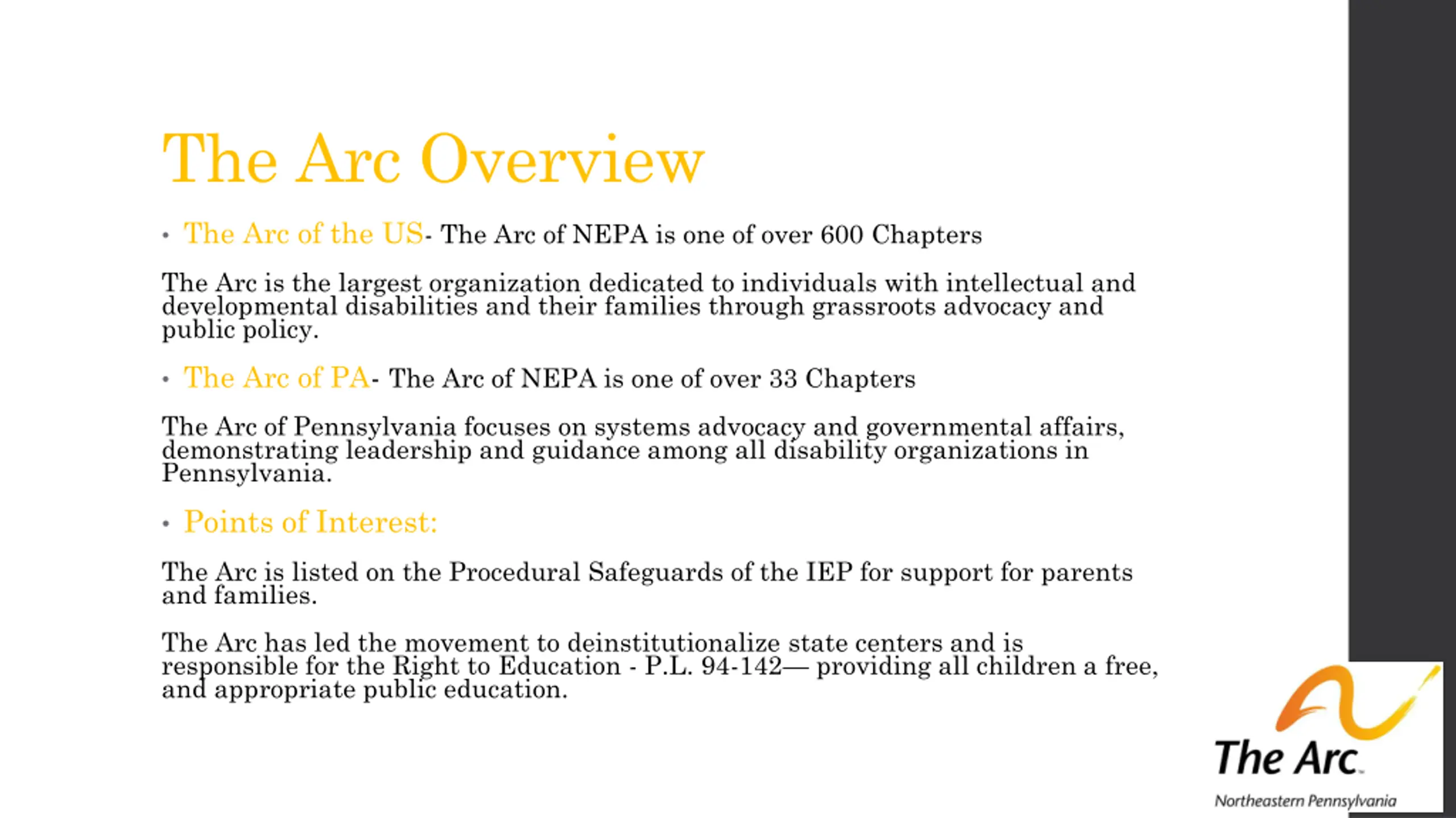 The Arc Overview The Arc of the US- The Arc of NEPA is one of over 600 Chapters The Arc is the largest organization dedicated to individuals with intellectual and developmental disabilities and their families through grassroots advocacy and public policy. The Arc of PA- The Arc of NEPA is one of over 33 Chapters The Arc of Pennsylvania focuses on systems advocacy and governmental affairs, demonstrating leadership and guidance among all disability organizations in Pennsylvania. Points of Interest: The Arc is listed on the Procedural Safeguards of the IEP for support for parents and families. The Arc has led the movement to deinstitutionalize state centers and is responsible for the Right to Education - P.L. 94-142 providing all children a free, and appropriate public education.