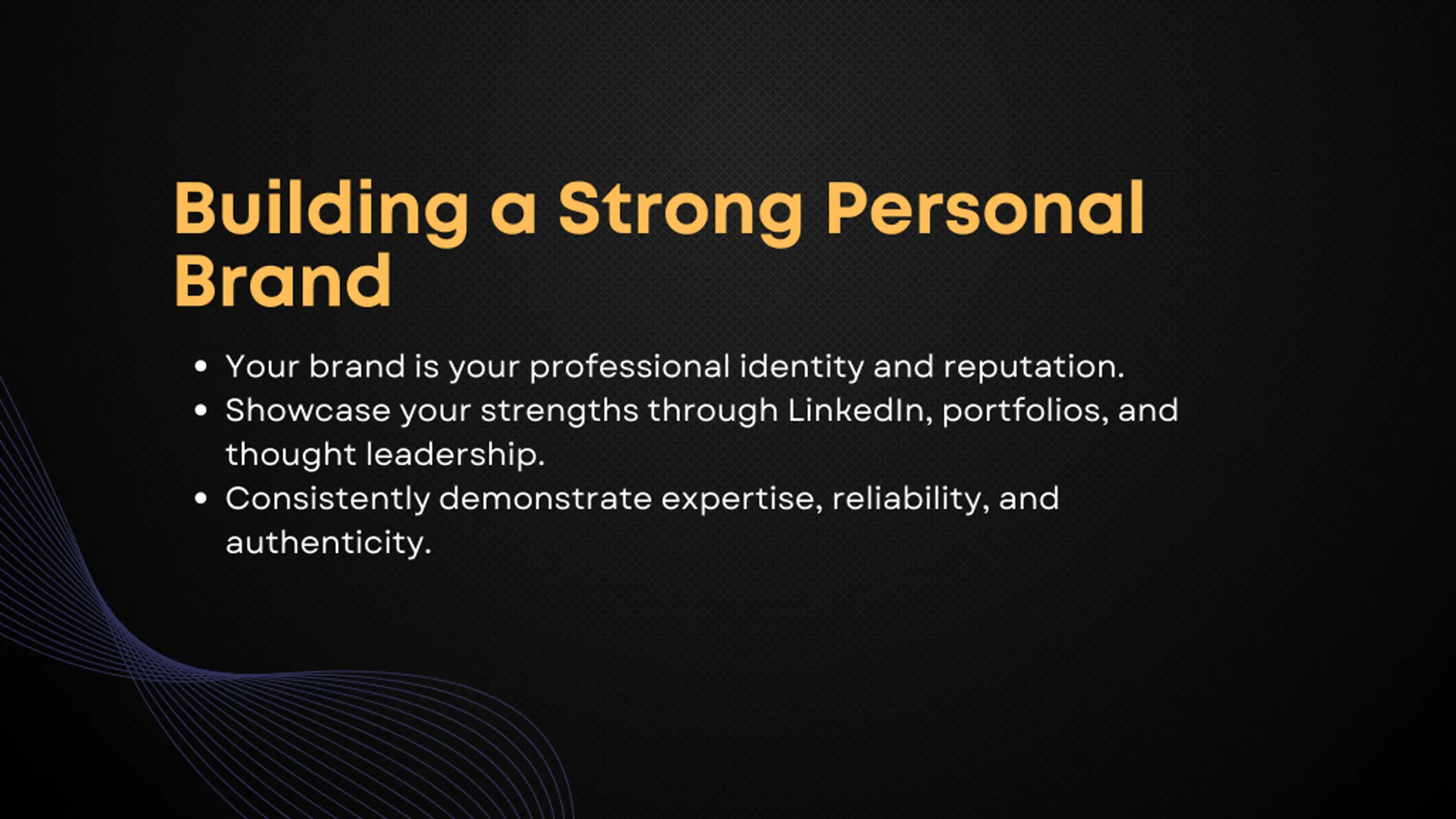 Building a Strong Personal Brand Your brand is your professional identity and reputation. Showcase your strengths through LinkedIn, portfolios, and thought leadership. Consistently demonstrate expertise, reliability, and authenticity.