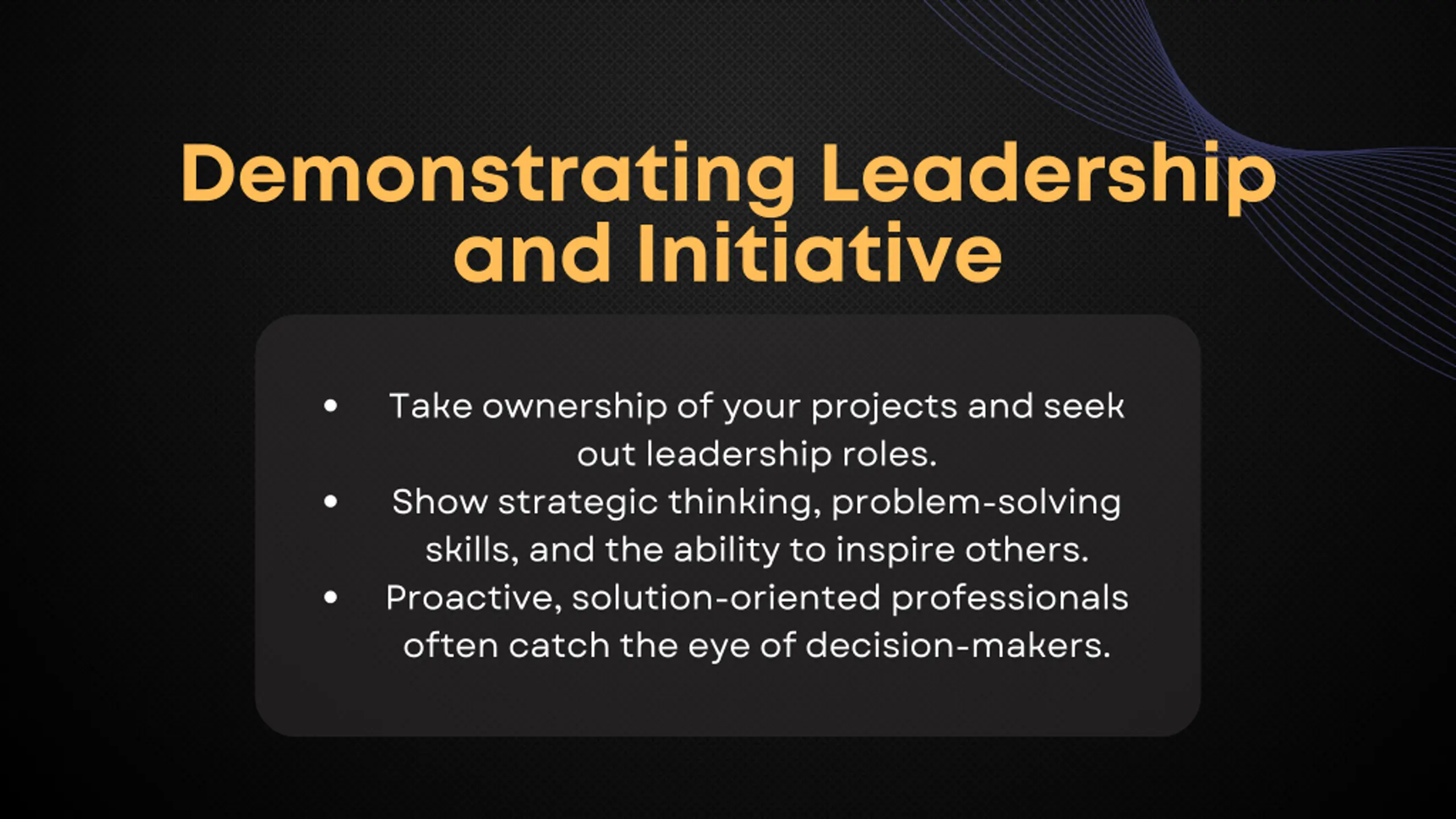 Demonstrating Leadership and Initiative Take ownership of your projects and seek out leadership roles. Show strategic thinking, problem-solving skills, and the ability to inspire others. Proactive, solution-oriented professionals often catch the eye of decision-makers.