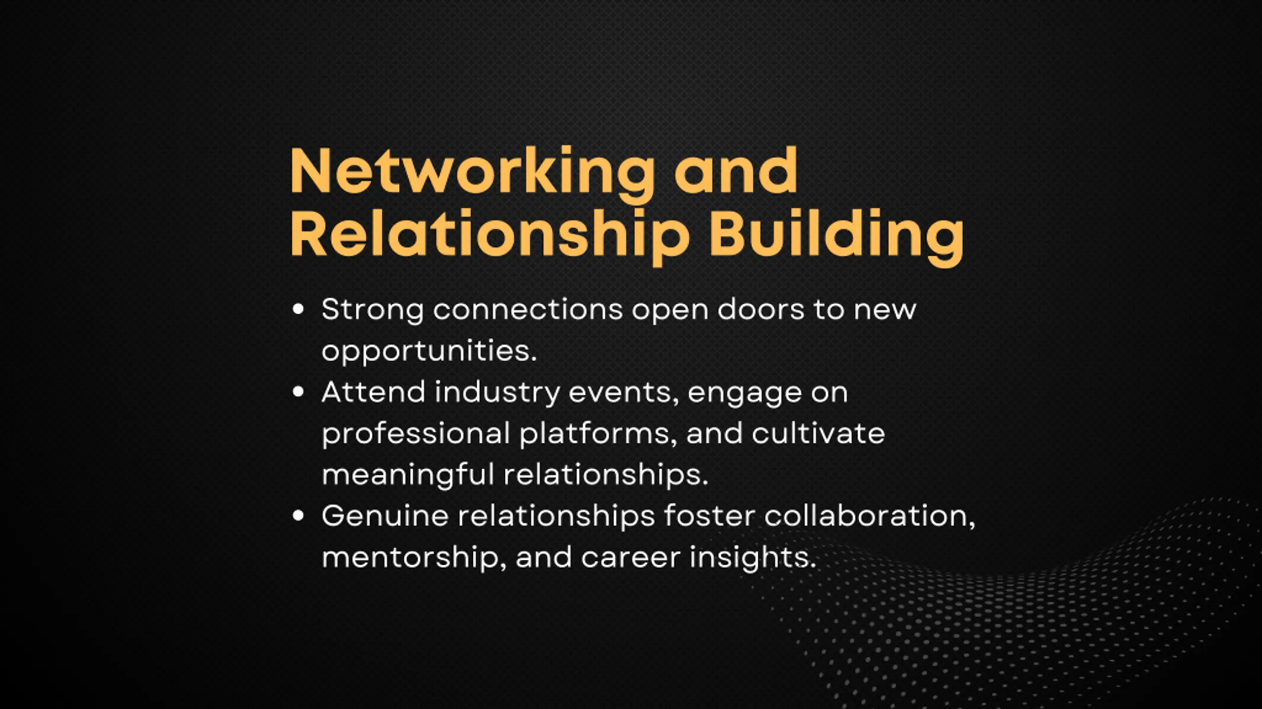 Networking and Relationship Building Strong connections open doors to new opportunities. Attend industry events, engage on professional platforms, and cultivate meaningful relationships. Genuine relationships foster collaboration, mentorship, and career insights.