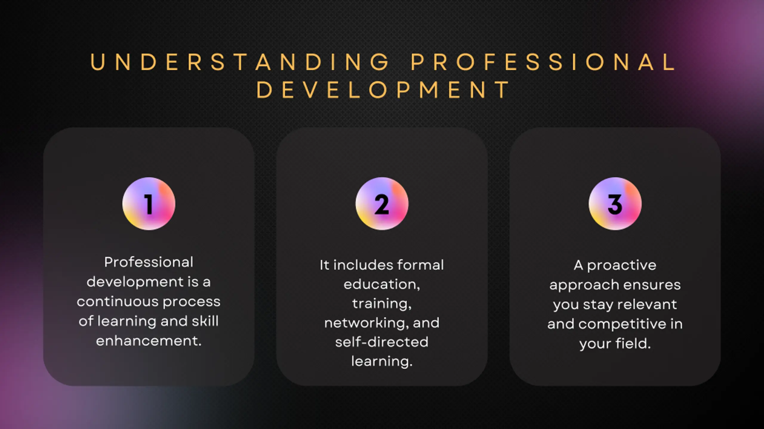 U N D E R S T A N D I N G P R O F E S S I O N A L D E V E L O P M E N T 2 1 3 Professional development is a continuous process of learning and skill enhancement. A proactive approach ensures you stay relevant and competitive in your field. It includes formal education, training, networking, and self-directed learning.