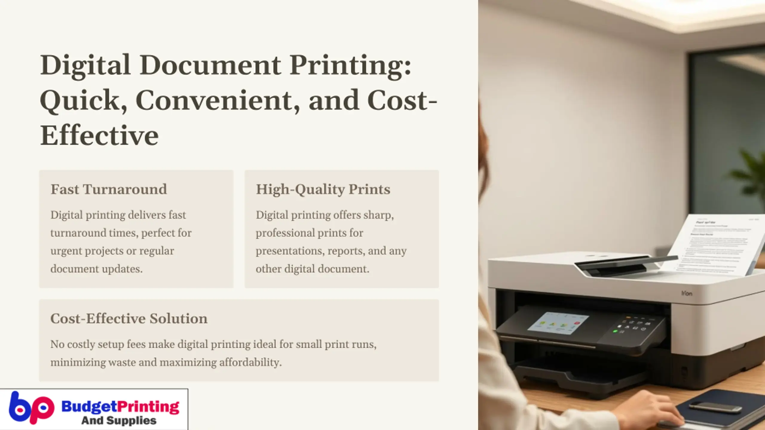 Digital Document Printing: Quick, Convenient, and Cost- Effective Fast Turnaround High-Quality Prints Digital printing delivers fast turnaround times, perfect for urgent projects or regular document updates. Digital printing offers sharp, professional prints for presentations, reports, and any other digital document. Cost-Effective Solution No costly setup fees make digital printing ideal for small print runs, minimizing waste and maximizing affordability. preencoded.png