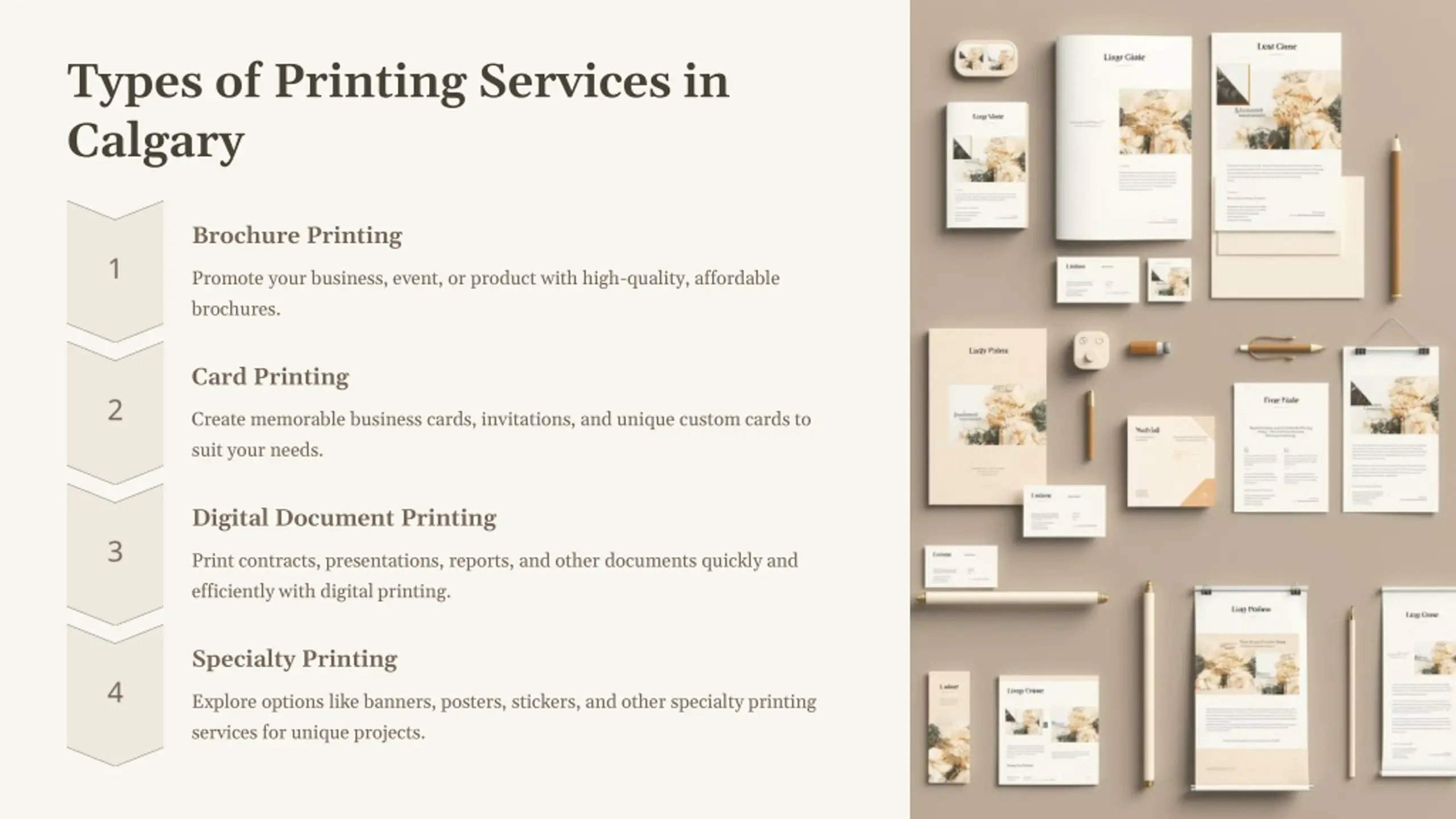 Types of Printing Services in Calgary Brochure Printing Promote your business, event, or product with high-quality, affordable brochures. Card Printing Create memorable business cards, invitations, and unique custom cards to suit your needs. Digital Document Printing Print contracts, presentations, reports, and other documents quickly and efficiently with digital printing. Specialty Printing Explore options like banners, posters, stickers, and other specialty printing services for unique projects. preencoded.png