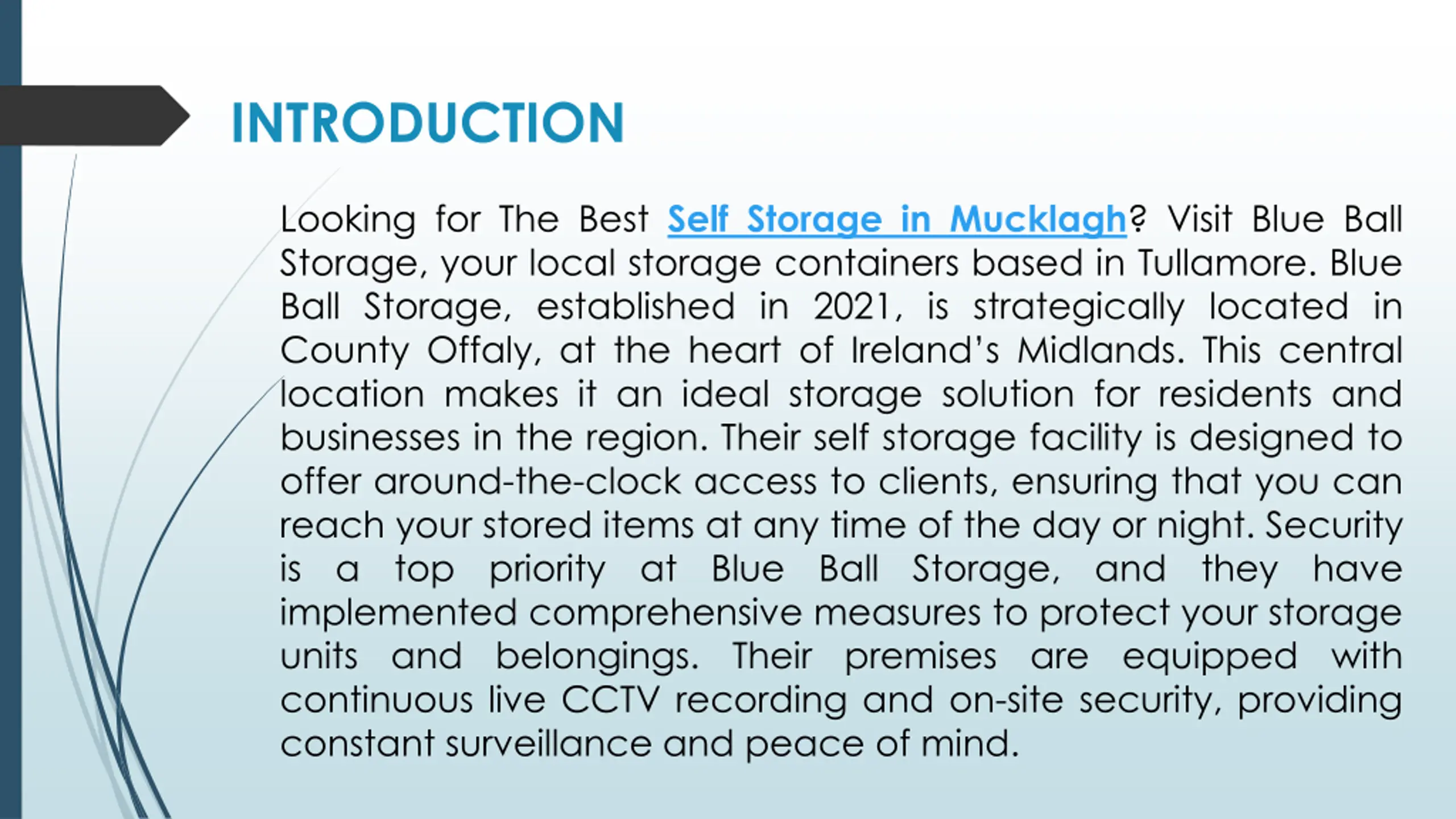 INTRODUCTION Looking for The Best Self Storage in Mucklagh? Visit Blue Ball Storage, your local storage containers based in Tullamore. Blue Ball Storage, established in 2021, is strategically located in County Offaly, at the heart of Ireland s Midlands. This central location makes it an ideal storage solution for residents and businesses in the region. Their self storage facility is designed to offer around-the-clock access to clients, ensuring that you can reach your stored items at any time of the day or night. Security is a top priority at Blue Ball Storage, and they have implemented comprehensive measures to protect your storage units and belongings. Their premises are equipped with continuous live CCTV recording and on-site security, providing constant surveillance and peace of mind.