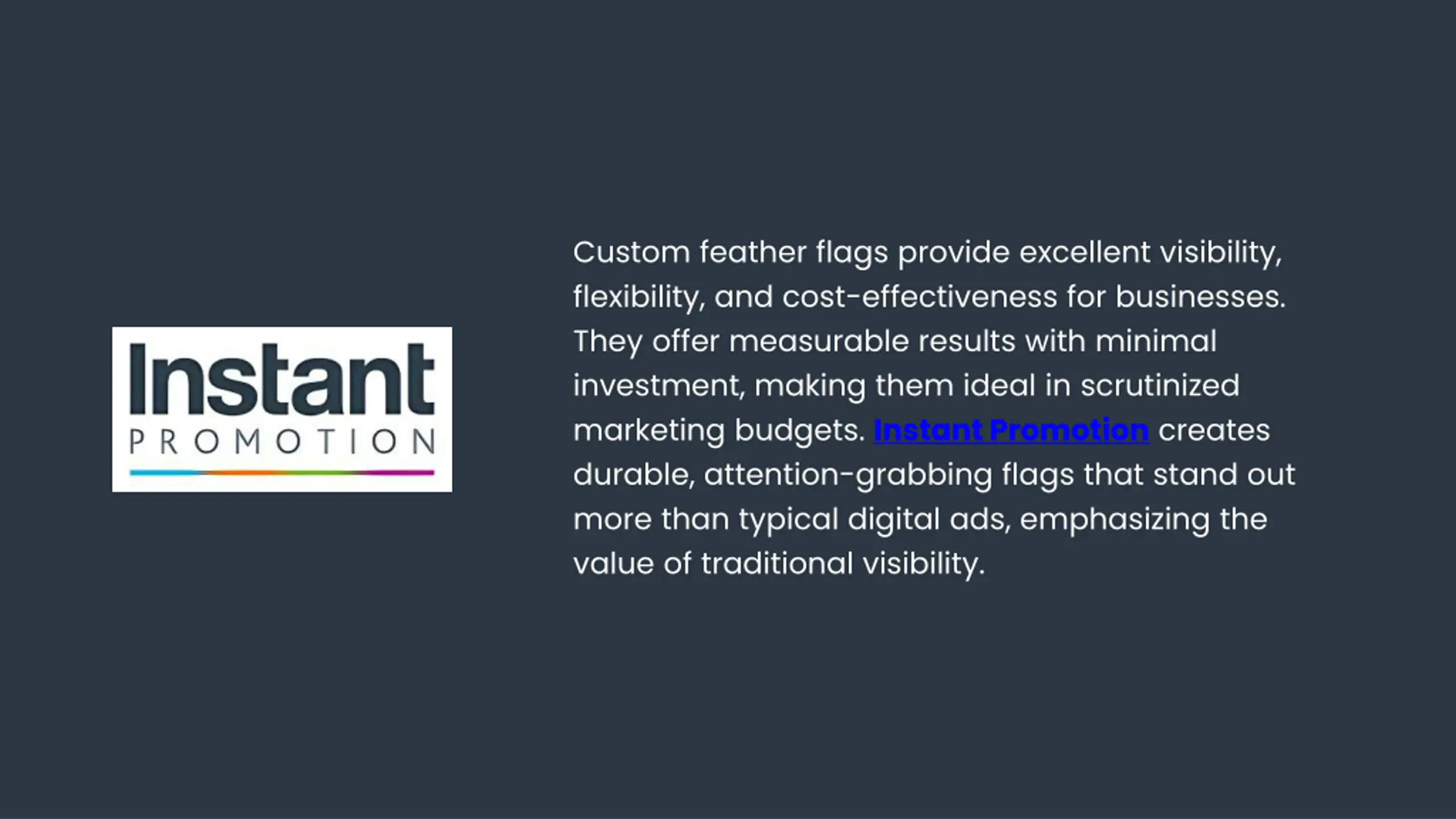 Custom feather flags provide excellent visibility, flexibility, and cost-effectiveness for businesses. They offer measurable results with minimal investment, making them ideal in scrutinized marketing budgets. Instant Promotion creates durable, attention-grabbing flags that stand out more than typical digital ads, emphasizing the value of traditional visibility.