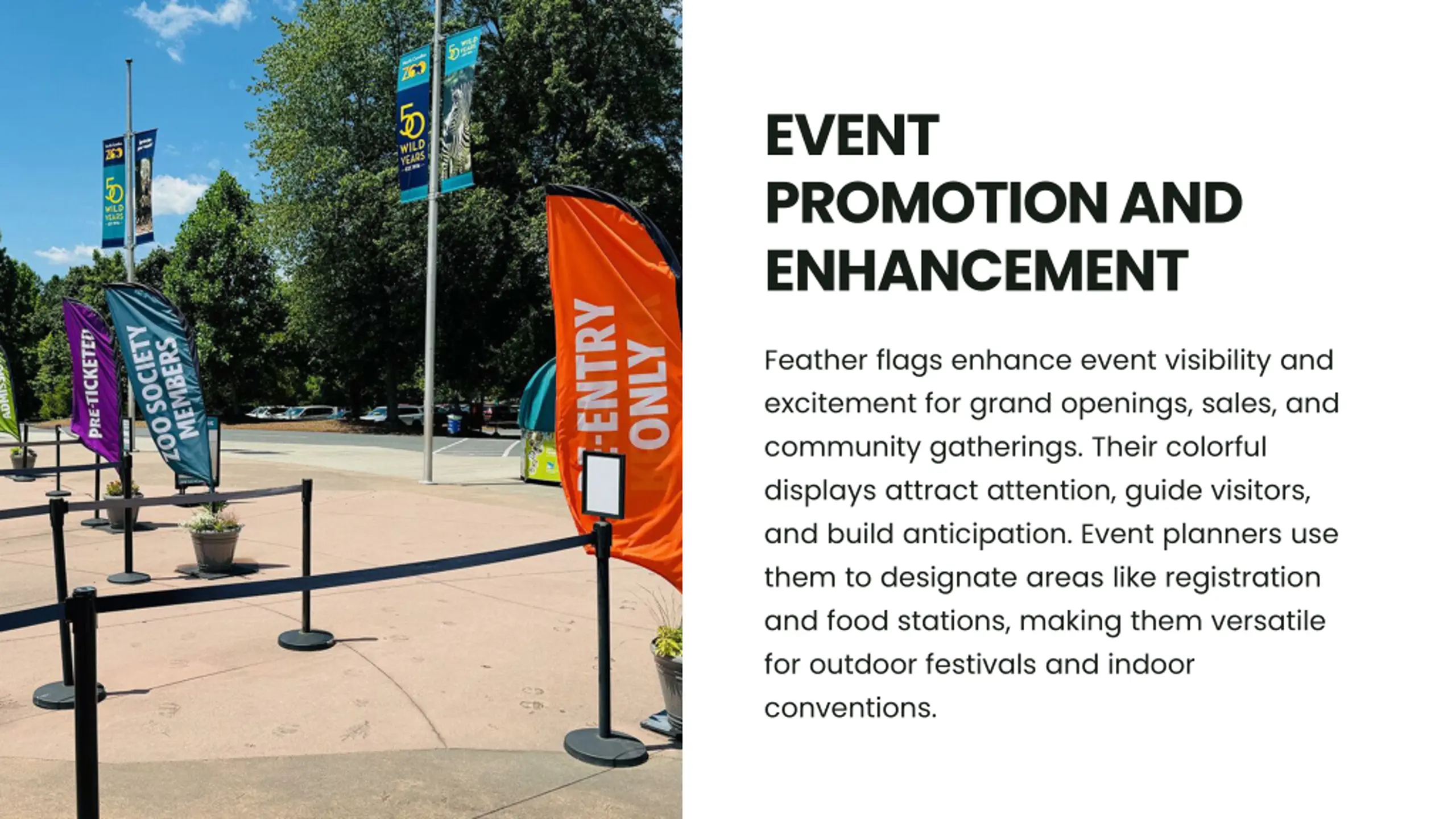EVENT PROMOTION AND ENHANCEMENT Feather flags enhance event visibility and excitement for grand openings, sales, and community gatherings. Their colorful displays attract attention, guide visitors, and build anticipation. Event planners use them to designate areas like registration and food stations, making them versatile for outdoor festivals and indoor conventions.