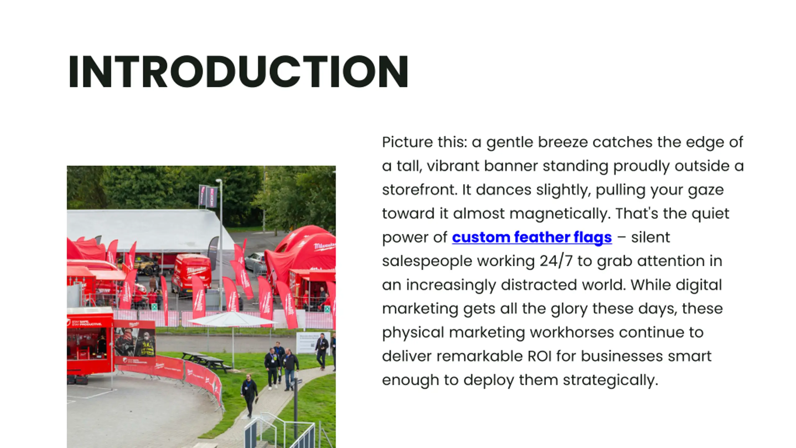 INTRODUCTION Picture this: a gentle breeze catches the edge of a tall, vibrant banner standing proudly outside a storefront. It dances slightly, pulling your gaze toward it almost magnetically. That's the quiet power of custom feather flags silent salespeople working 24/7 to grab attention in an increasingly distracted world. While digital marketing gets all the glory these days, these physical marketing workhorses continue to deliver remarkable ROI for businesses smart enough to deploy them strategically.