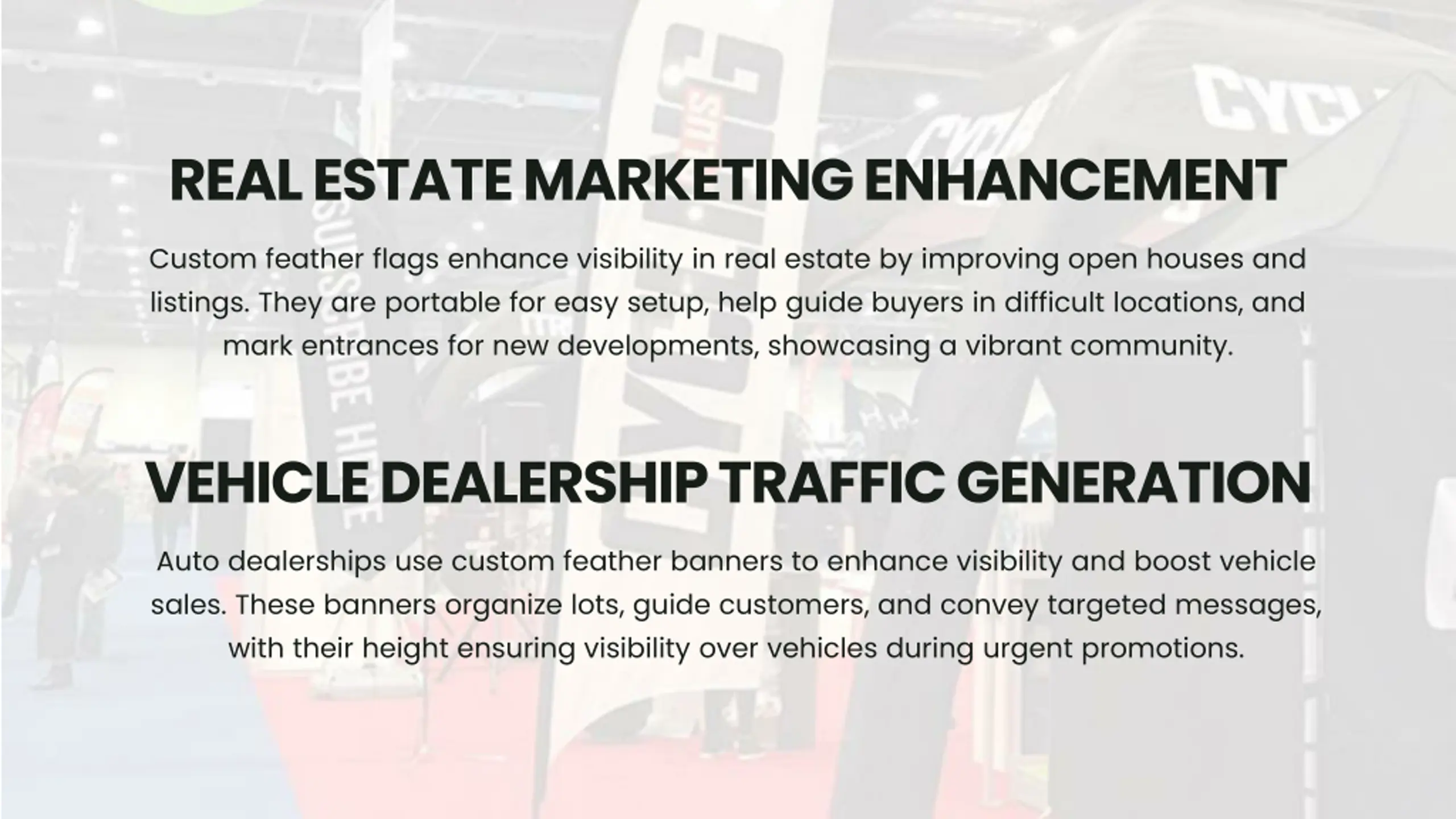 REAL ESTATE MARKETING ENHANCEMENT Custom feather flags enhance visibility in real estate by improving open houses and listings. They are portable for easy setup, help guide buyers in difficult locations, and mark entrances for new developments, showcasing a vibrant community. VEHICLE DEALERSHIP TRAFFIC GENERATION Auto dealerships use custom feather banners to enhance visibility and boost vehicle sales. These banners organize lots, guide customers, and convey targeted messages, with their height ensuring visibility over vehicles during urgent promotions.