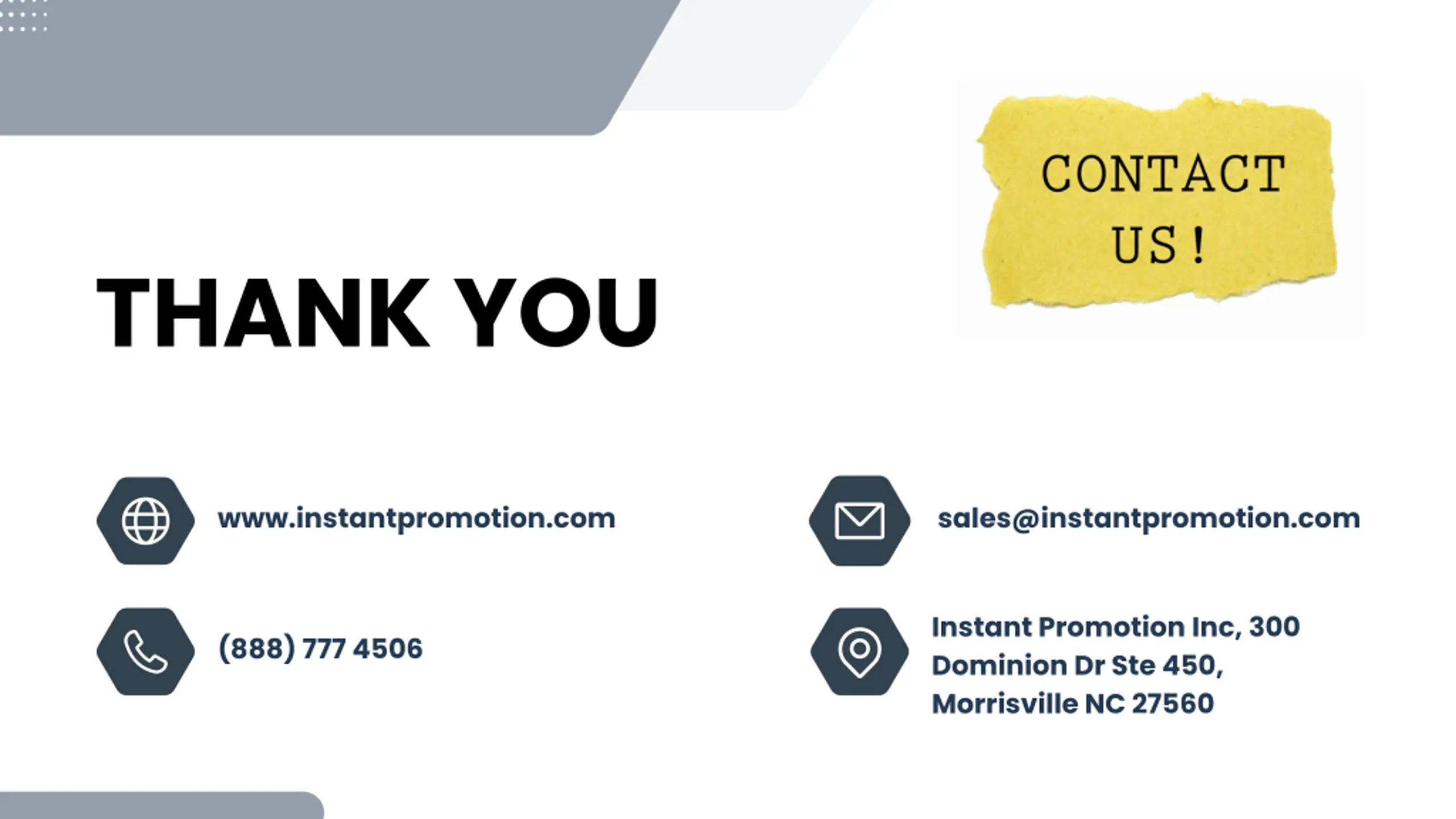 THANK YOU www.instantpromotion.com sales@instantpromotion.com Instant Promotion Inc, 300 Dominion Dr Ste 450, Morrisville NC 27560 (888) 777 4506