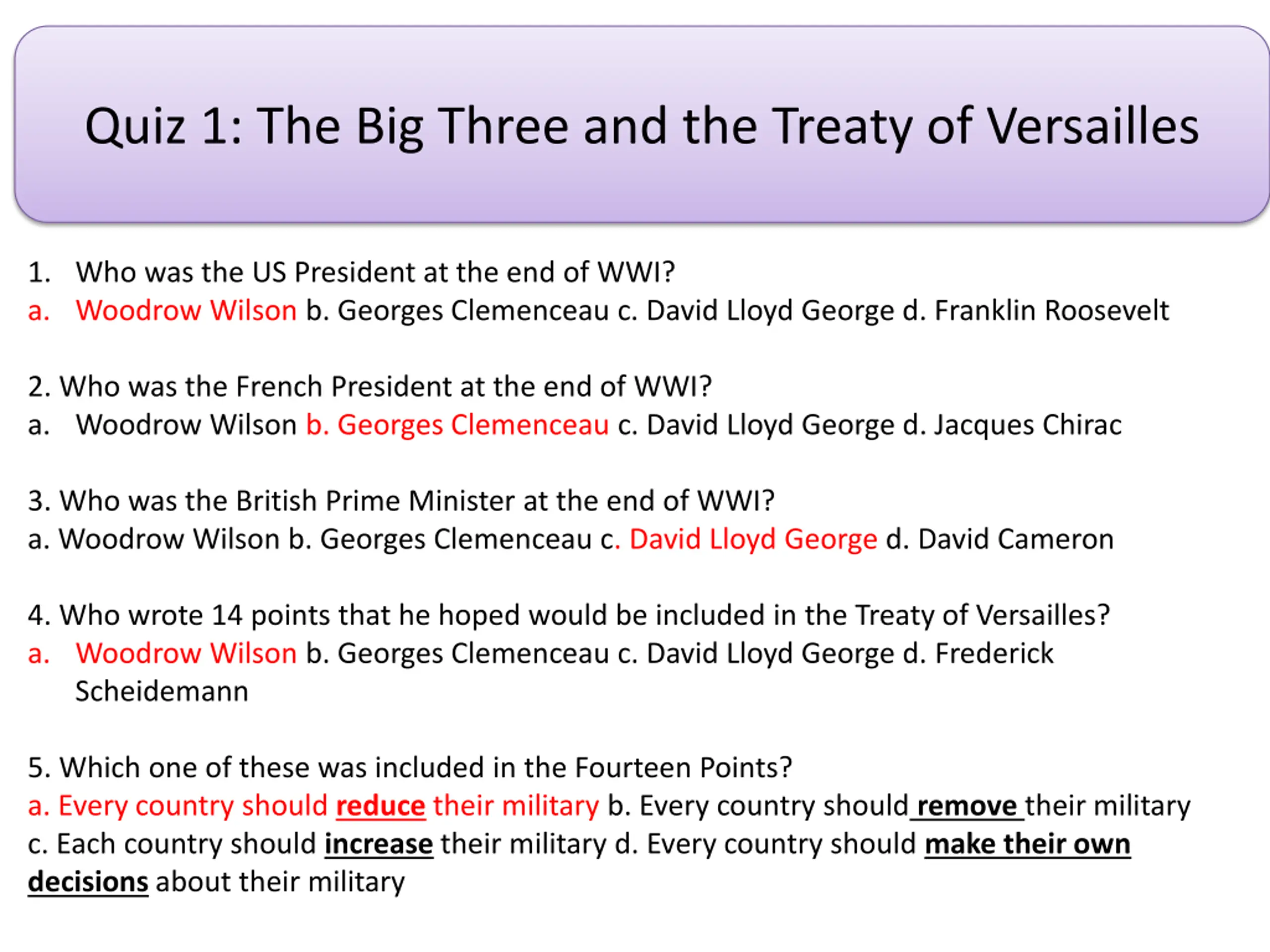 Quiz 1: The Big Three and the Treaty of Versailles 1. Who was the US President at the end of WWI? a. Woodrow Wilson b. Georges Clemenceau c. David Lloyd George d. Franklin Roosevelt 2. Who was the French President at the end of WWI? a. Woodrow Wilson b. Georges Clemenceau c. David Lloyd George d. Jacques Chirac 3. Who was the British Prime Minister at the end of WWI? a. Woodrow Wilson b. Georges Clemenceau c. David Lloyd George d. David Cameron 4. Who wrote 14 points that he hoped would be included in the Treaty of Versailles? a. Woodrow Wilson b. Georges Clemenceau c. David Lloyd George d. Frederick Scheidemann 5. Which one of these was included in the Fourteen Points? a. Every country should reduce their military b. Every country should remove their military c. Each country should increase their military d. Every country should make their own decisions about their military